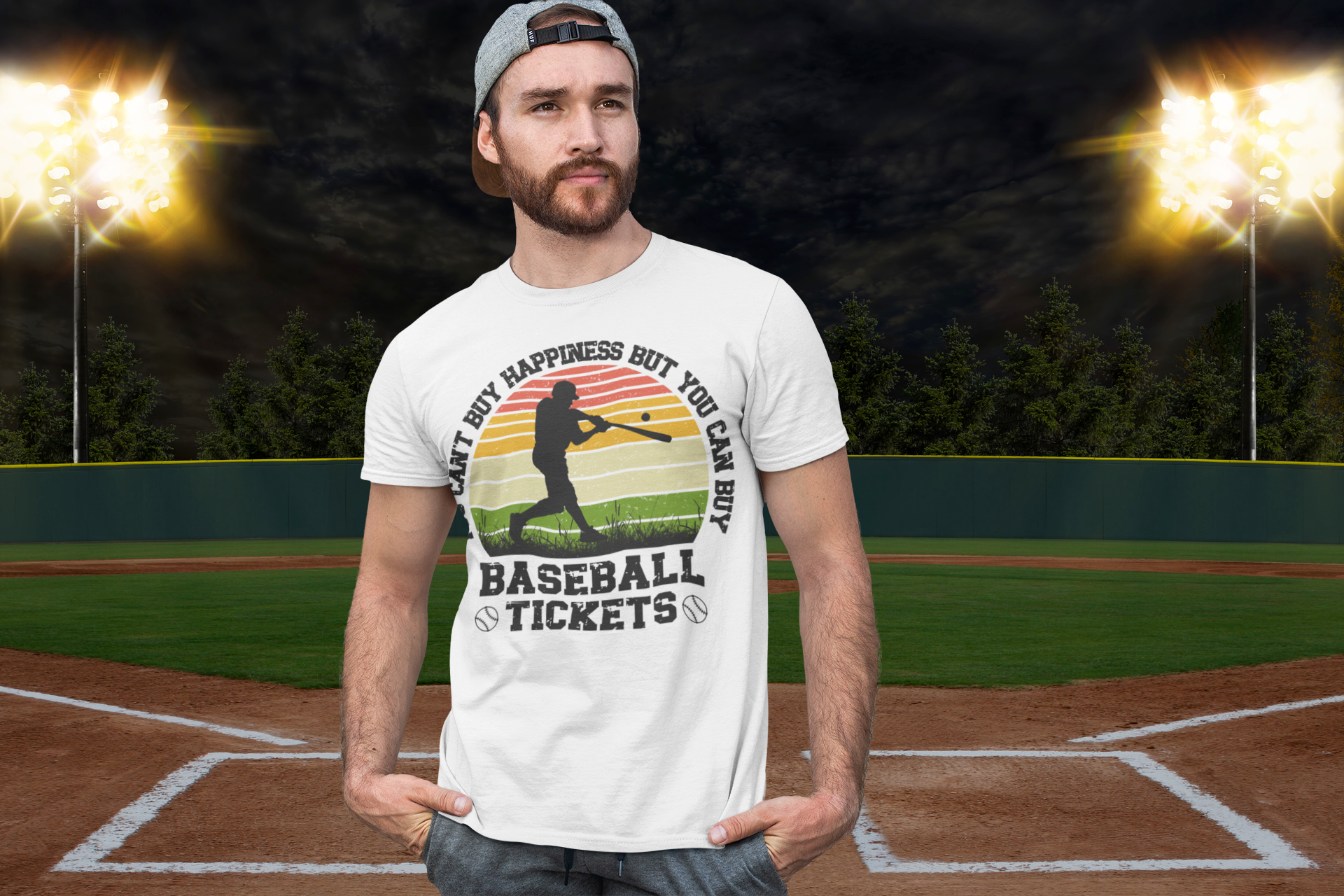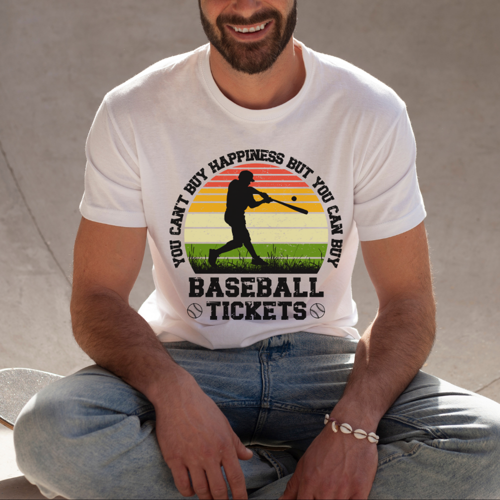 Score smiles and applause with our playful graphic t-shirt! The phrase "You can’t buy happiness but you can buy baseball tickets" says it all – it's a witty way to express your love for the sport and those exhilarating game-day moments. Comfort meets charm with this tee, making it a favorite choice for casual outings, game days, or anywhere you want to show off your passion. Get ready to spread happiness and style with this delightful shirt!
