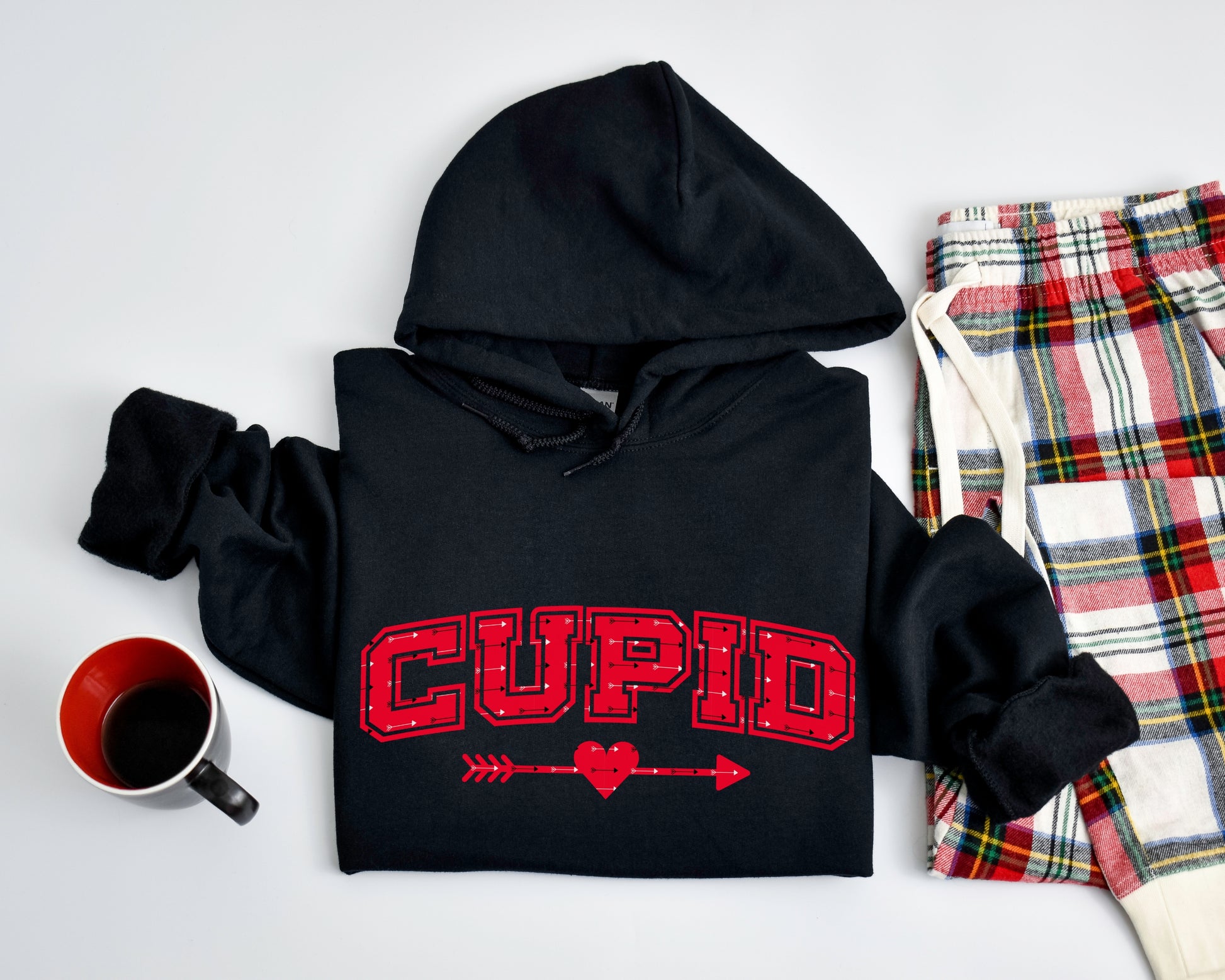 Fall head over heels for our Cupid hoodie, a fun addition to your wardrobe that’s sure to turn heads! Featuring the bold word "CUPID" with a heart and arrow graphic underneath, both adorned with a playful arrow pattern, this design is perfect for anyone who loves stylish, eye-catching details.