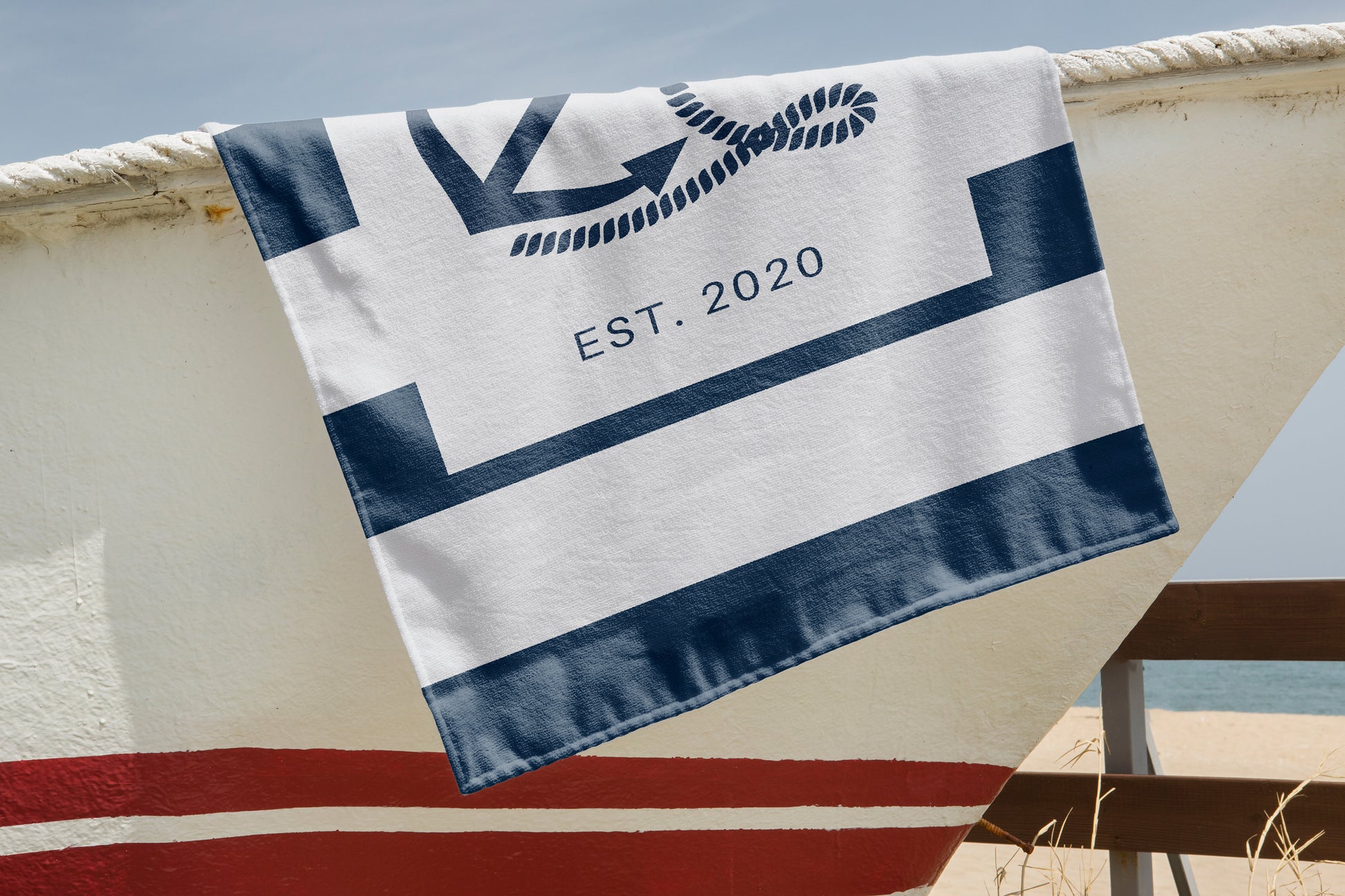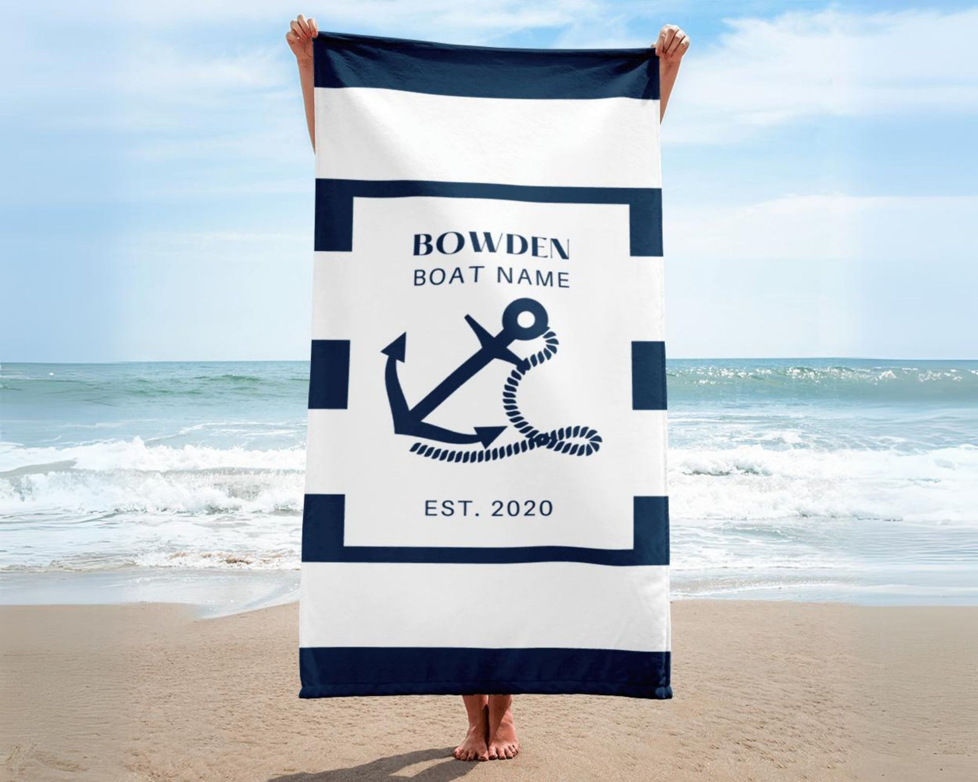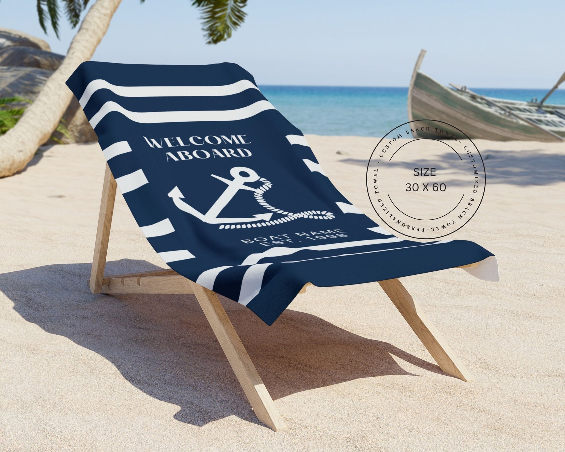 Set sail with our Personalized Nautical Beach Towel! Featuring an anchor, stripes, and optional 'Welcome Aboard,' this towel offers four customizable lines for your name, boat name, and year. Available in two classic colors, it’s the perfect gift for nautical enthusiasts and maritime lovers!