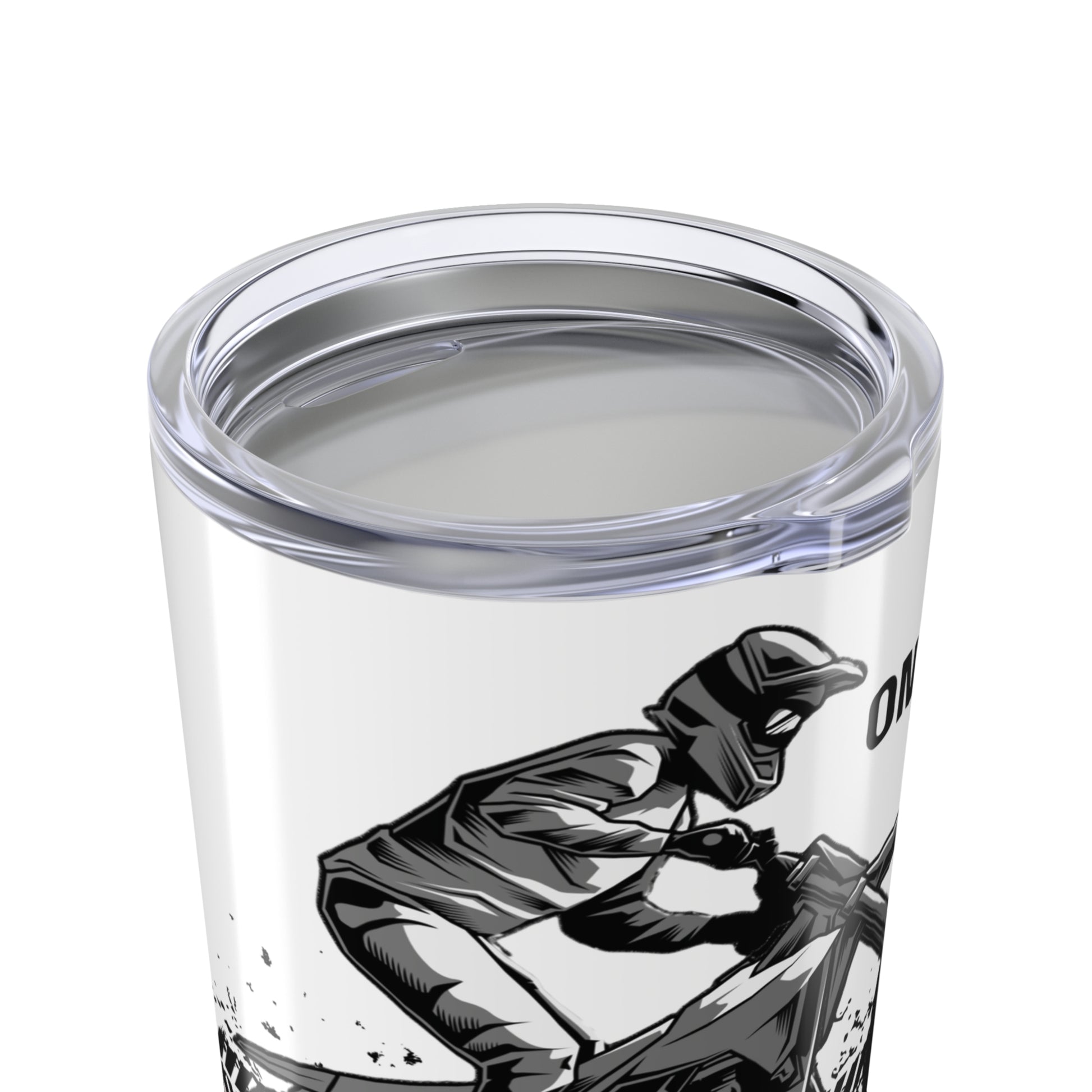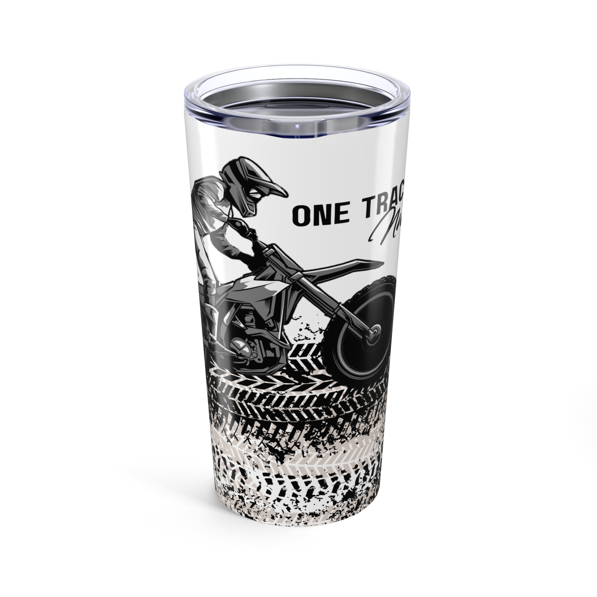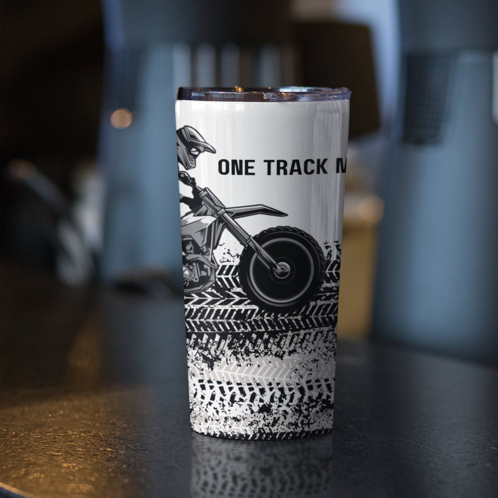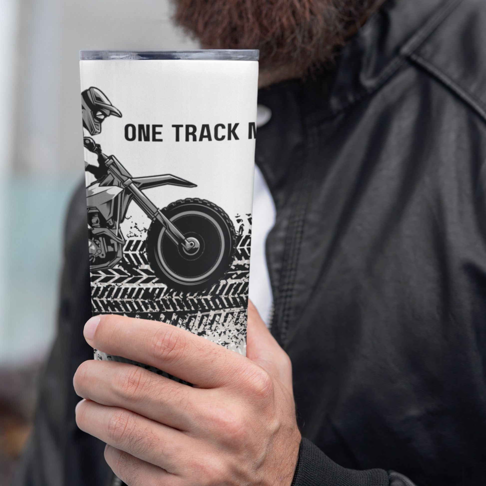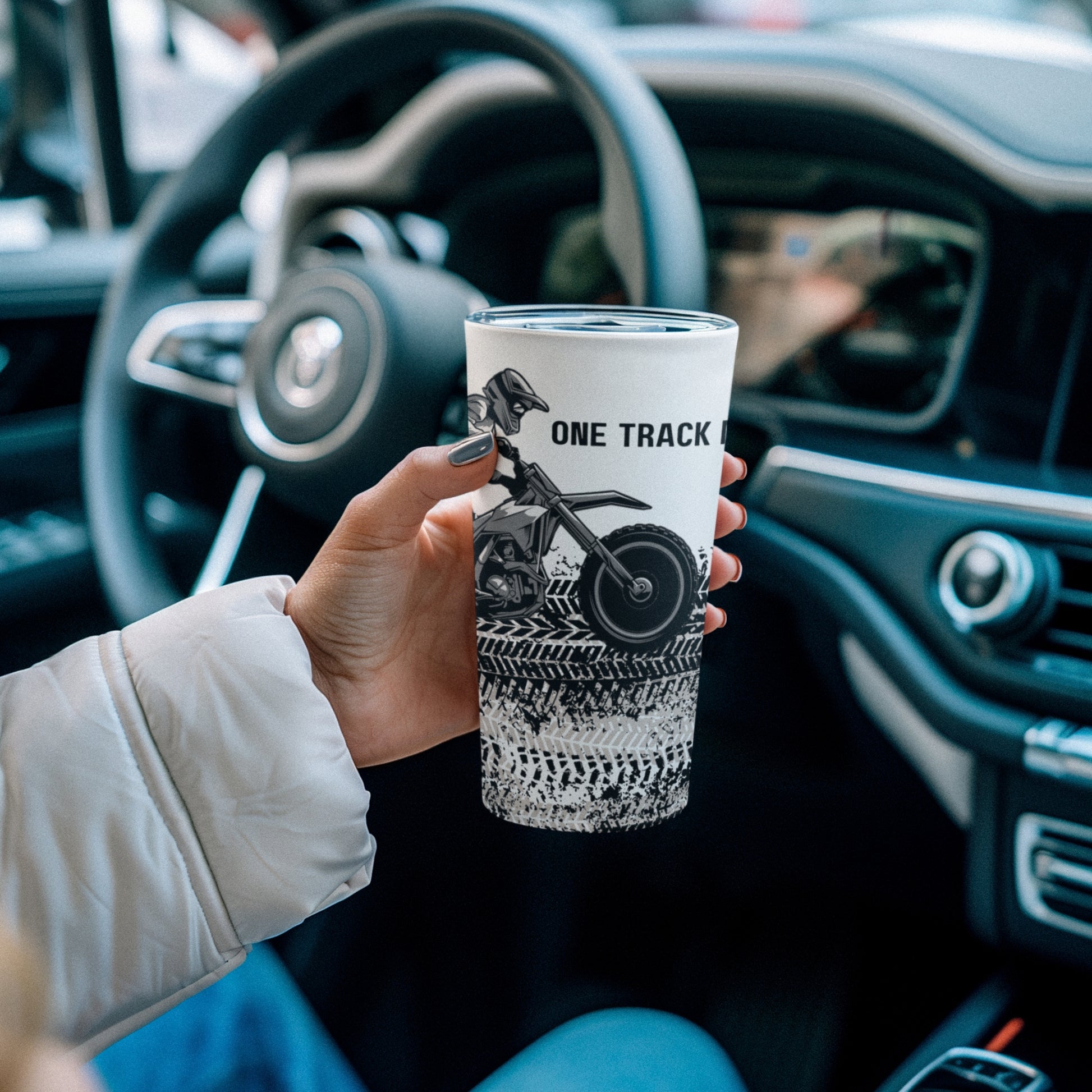 Rev up your routine with the One Track Mind 20 oz Stainless Steel Travel Tumbler. Designed for dirtbike fans and off-road adventurers, this tumbler features a bold illustration of a rider in action alongside the phrase "One Track Mind", perfect for those who live for the ride and keep their focus on the trail ahead.