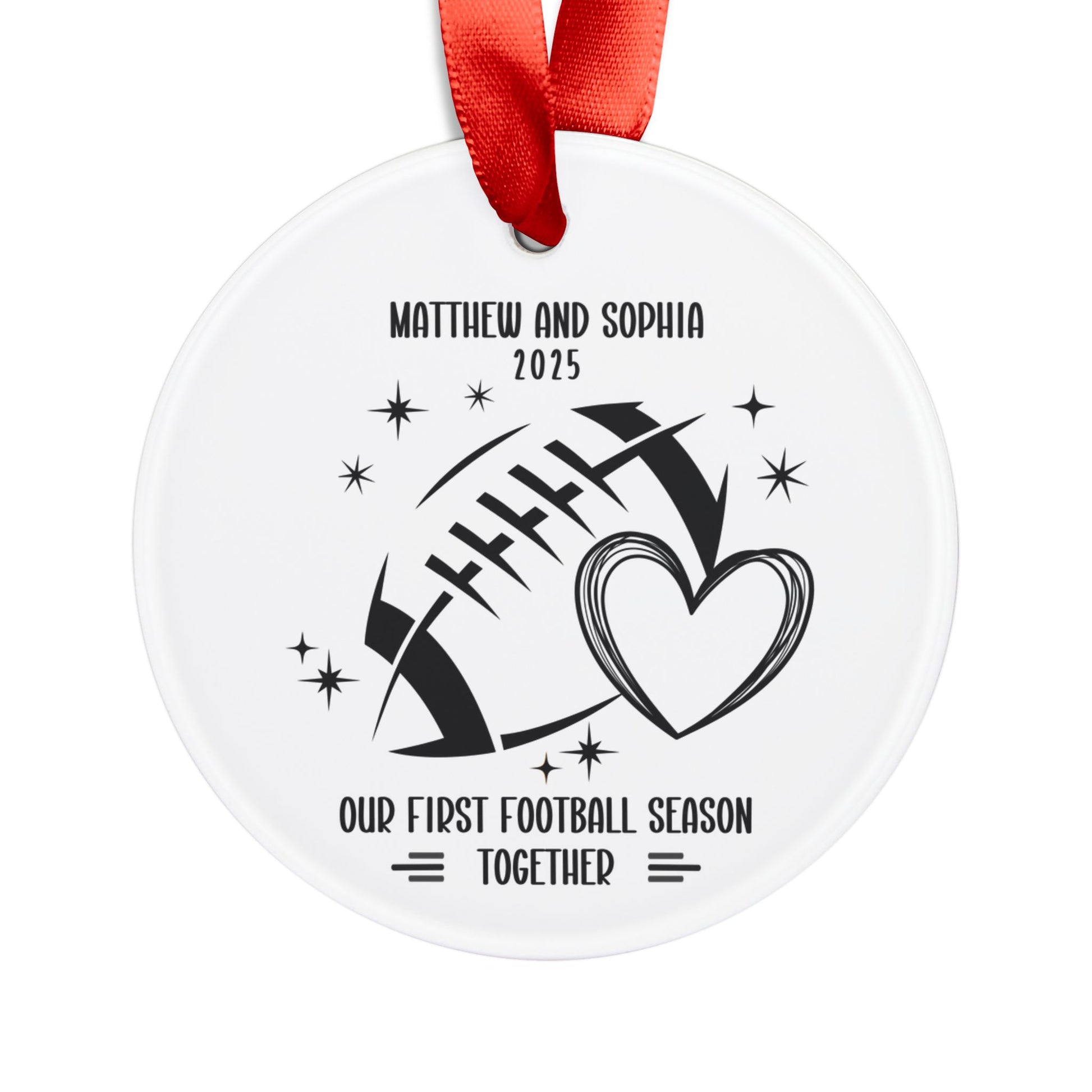Celebrate Love & the Game! Mark a special milestone with our football couple ornament, featuring a heart and football with the phrase “Our First Football Season Together.” Personalized with your names and the year, this keepsake captures both your bond and your shared love of the game.