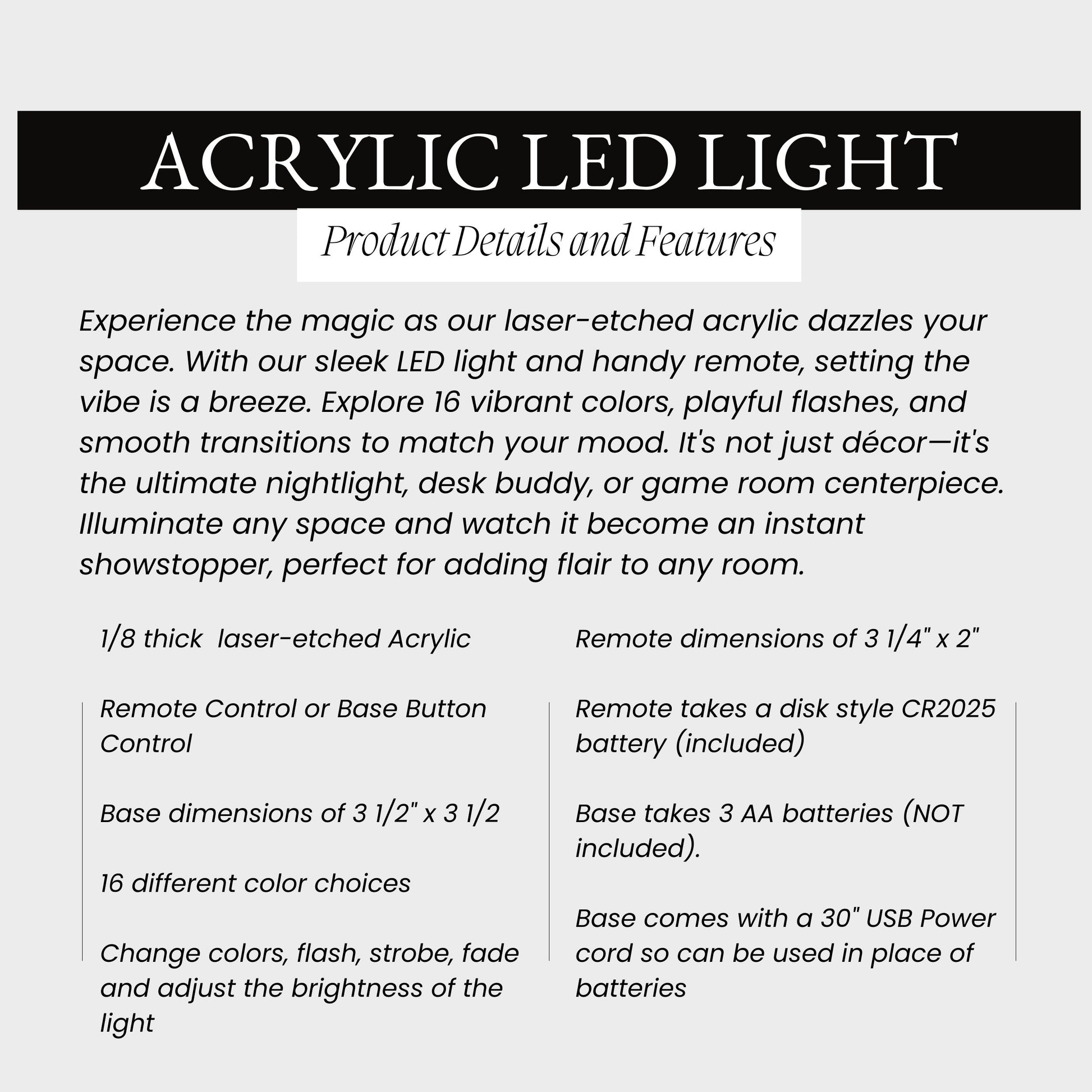 Acrylic dimensions shown in photos - LED light base: 3 1/2" x 3 1/2", offering 16 different color options