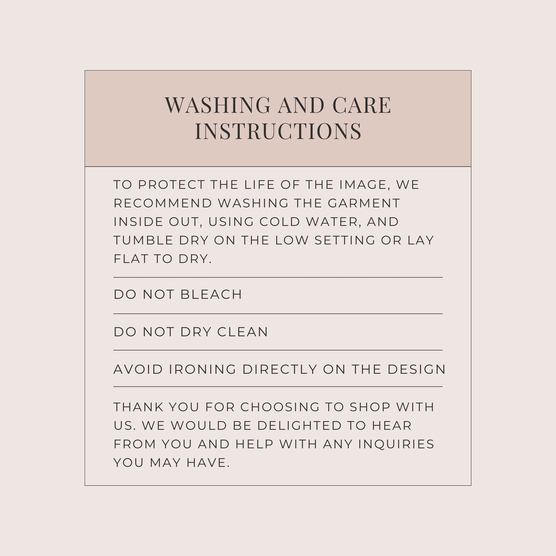 To protect the life of the image, we recommend washing the garment inside out, using cold water, and tumble dry on the low setting or lay flat to dry.