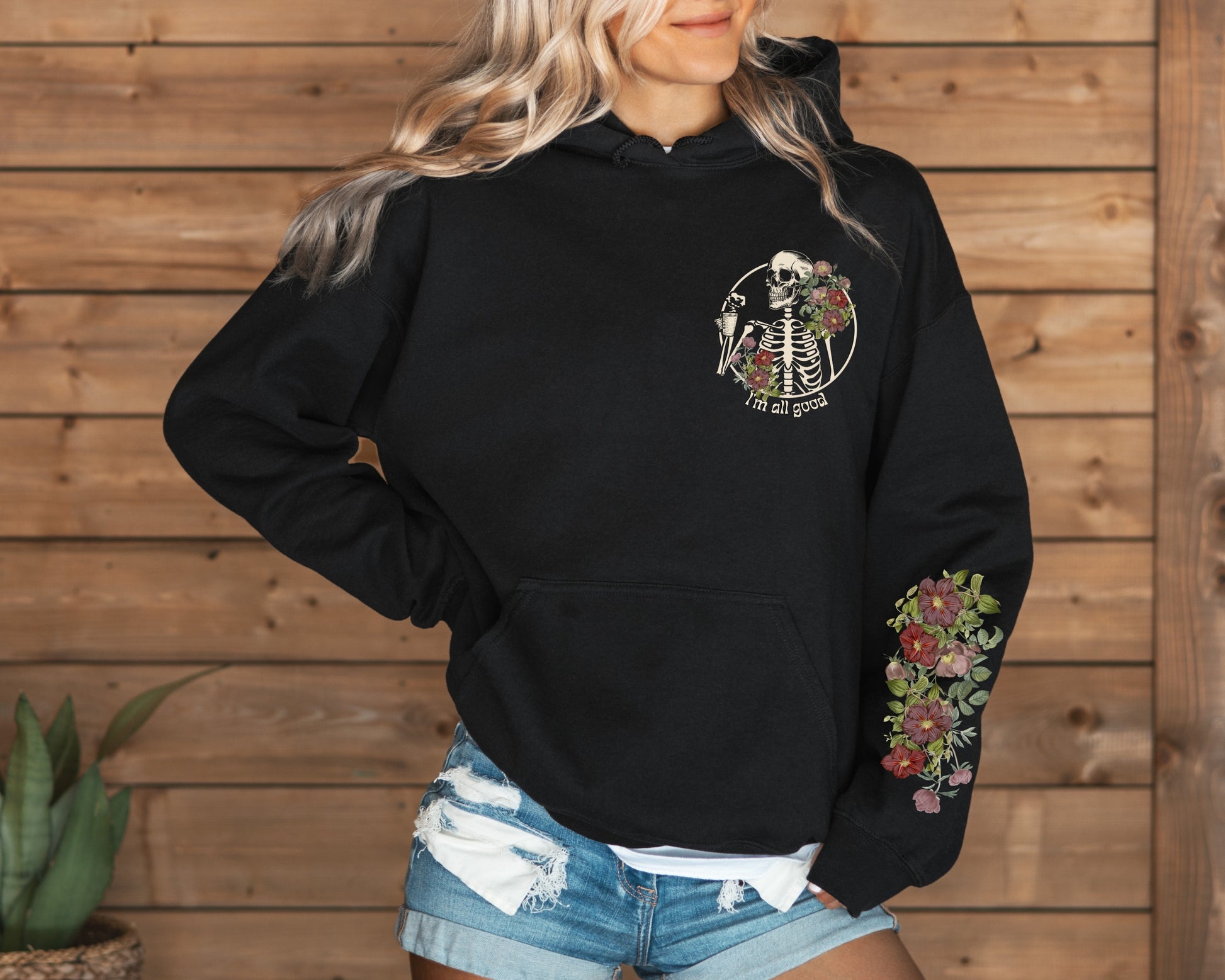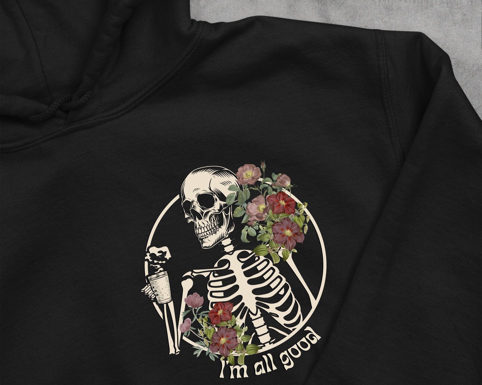Embrace your laid-back vibe with a dash of sarcastic charm in our 'I'm All Good' sweatshirt. Featuring a carefree skeleton enjoying a cup of coffee, surrounded by vibrant flowers, this design is for the coffee-loving, free spirit with a sense of humor. The witty "I'm all good" message adds a playful twist to your everyday look, letting you keep things light while staying true to yourself.