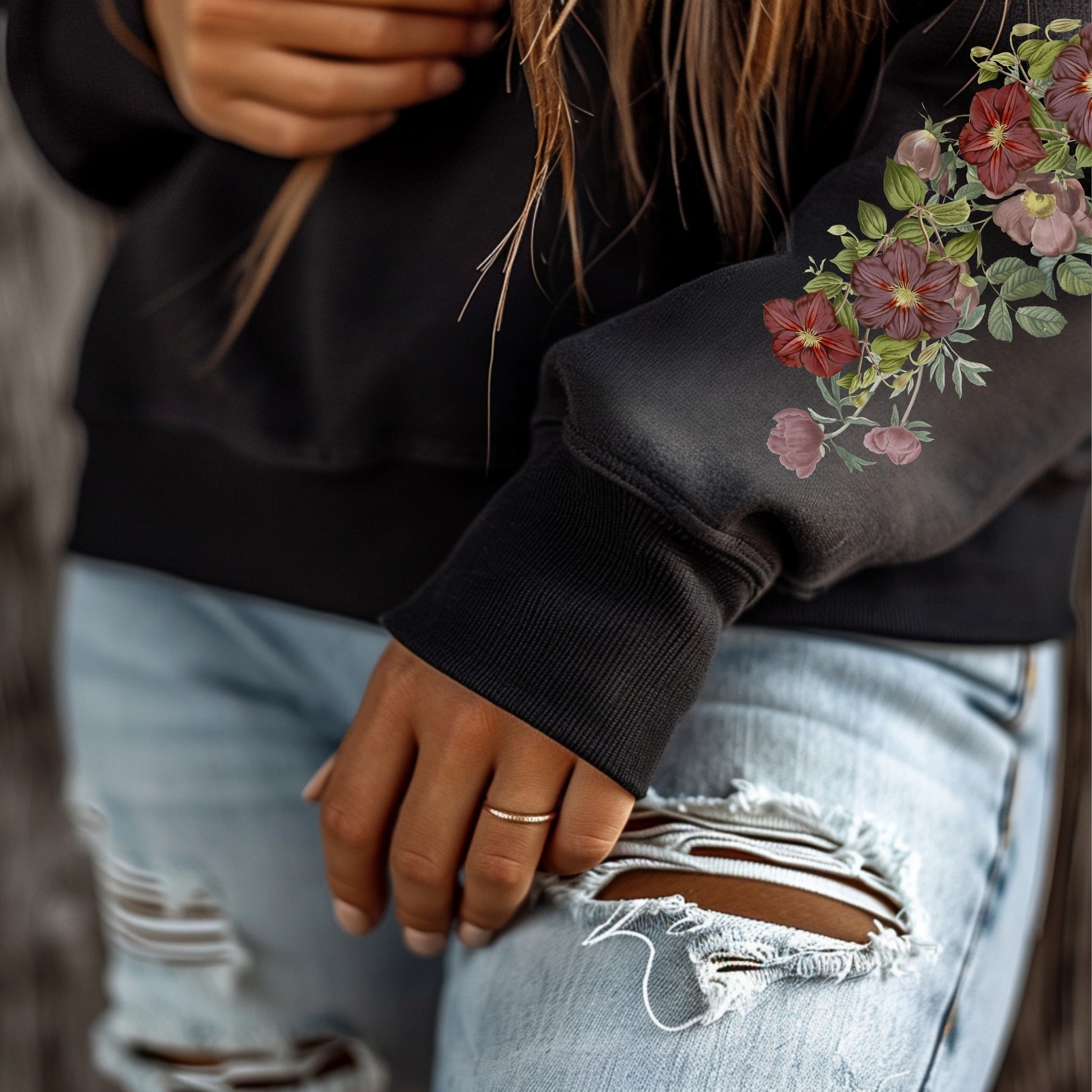 With its cozy fit and whimsical floral sleeve print, this sweatshirt is ideal for those who love unique style without sacrificing comfort. Whether you're lounging at home, grabbing coffee with friends, or running errands, this piece brings the perfect blend of edge and charm to your wardrobe.