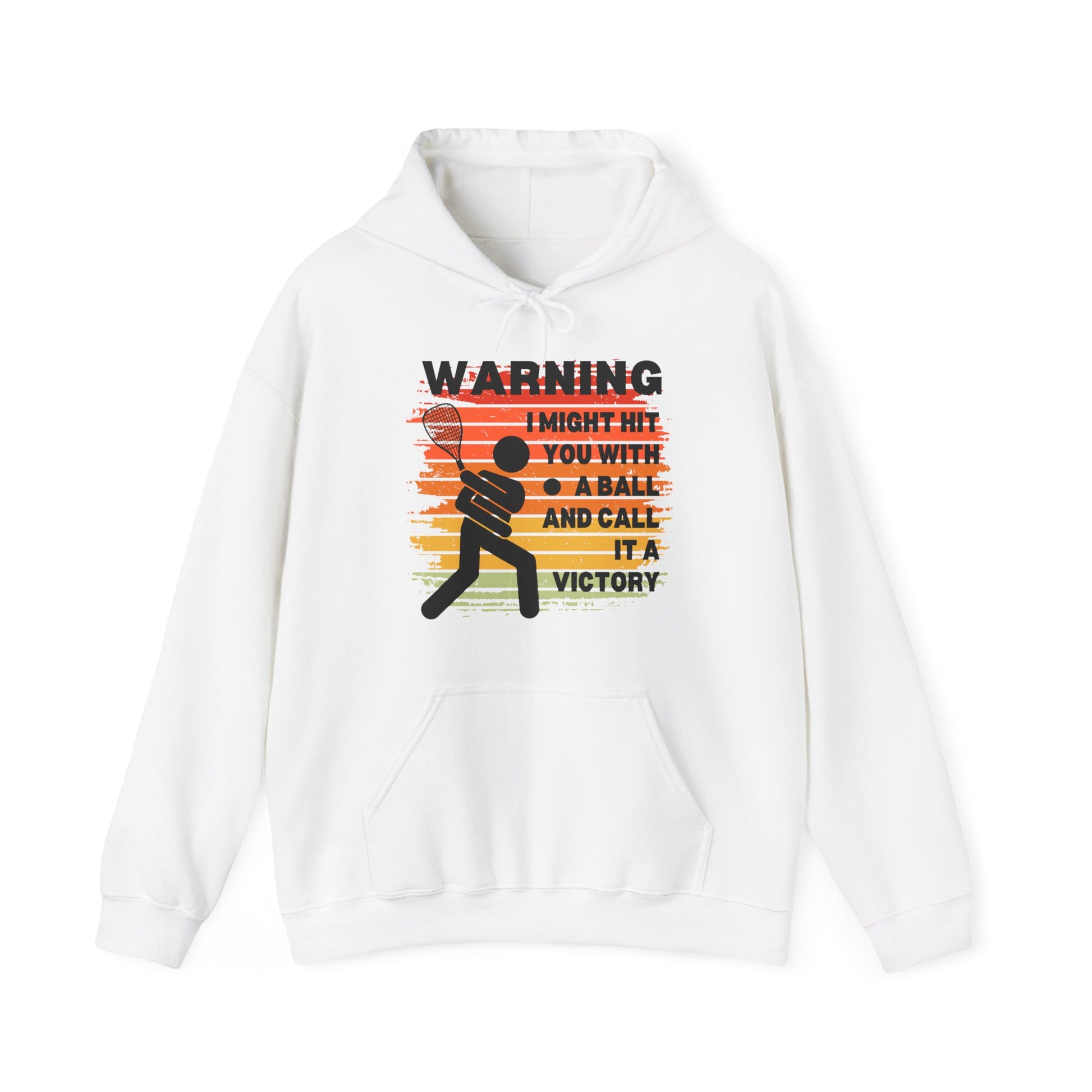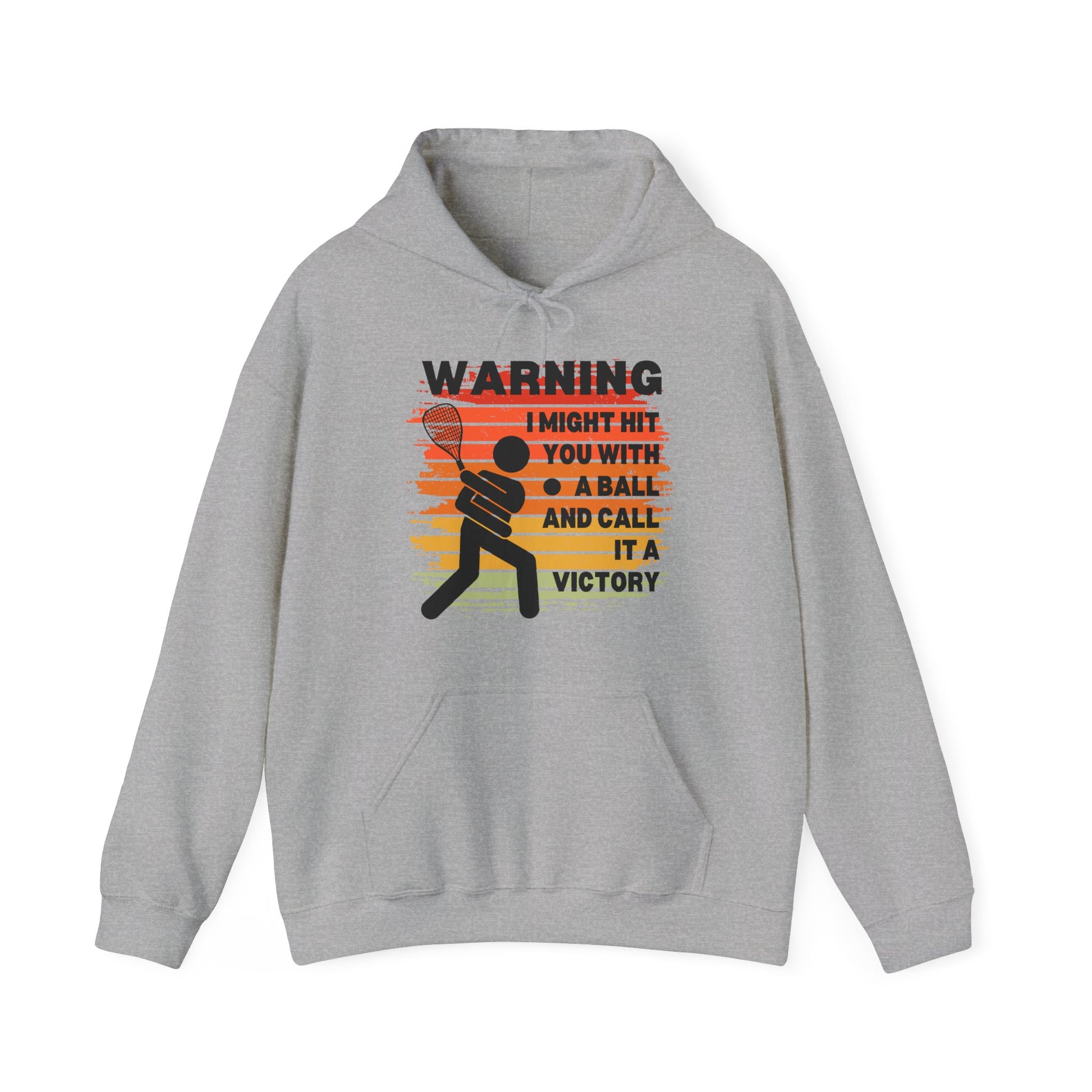 Gear up for playful victories on the racquetball court with our witty "Warning, I might hit you with a ball and call it a victory" hooded sweatshirt. Crafted for those who embrace the game with humor and a competitive spirit, this shirt is a bold declaration of your racquetball prowess. With its eye-catching design against a vibrant sunset backdrop, it's an instant conversation starter. Not only will you make a stylish statement, but you'll also enjoy the comfort and freedom of movement it offers. Get ready to serve up smiles, claim victories, and dominate the court with a playful edge.