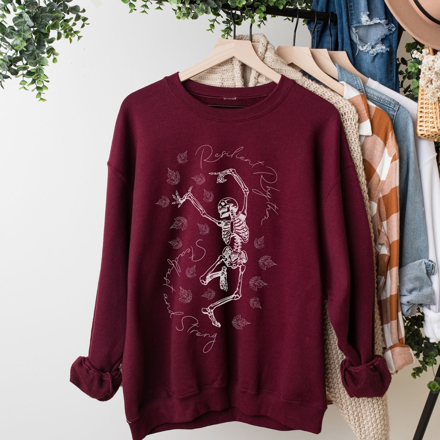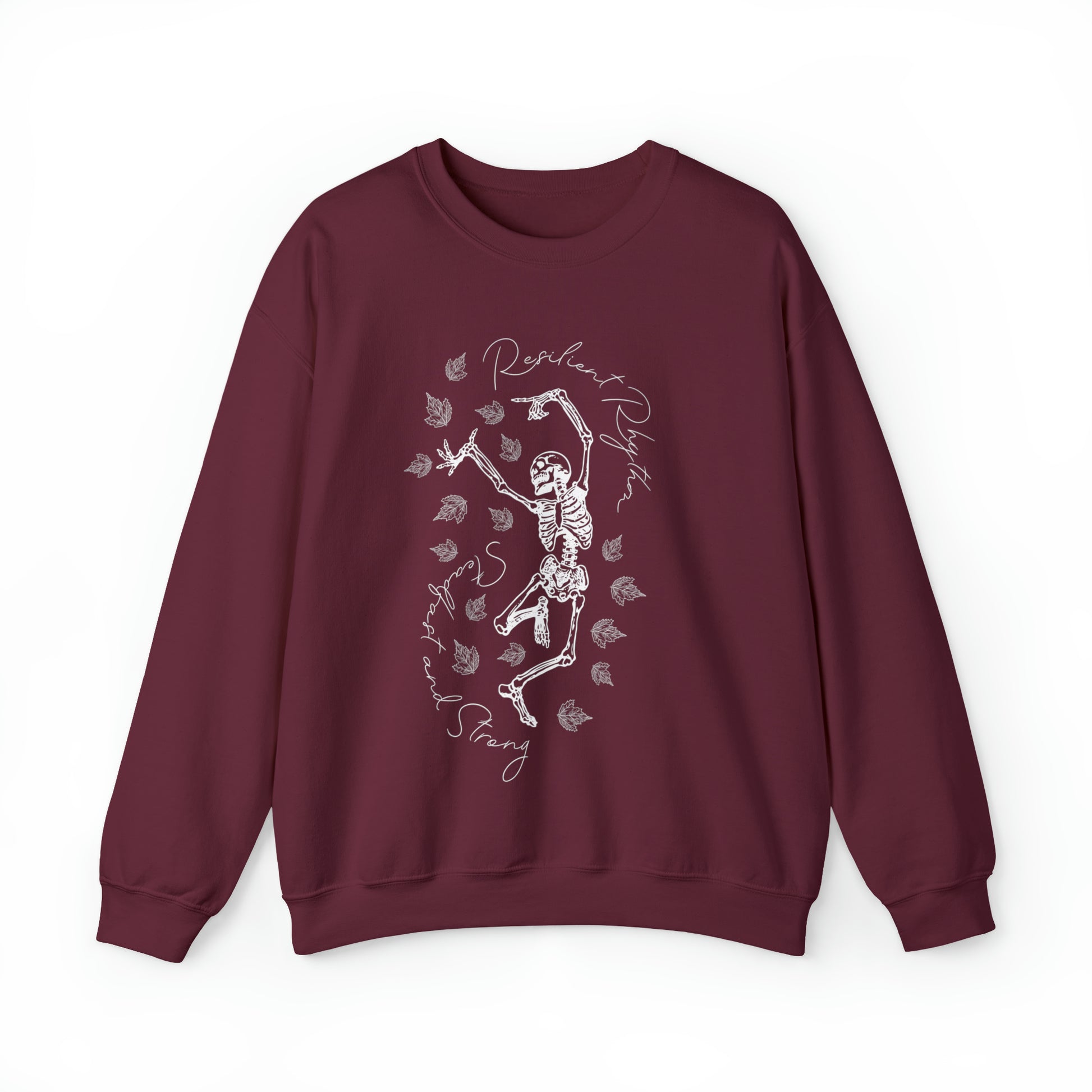 Embrace the perfect addition to your fall wardrobe as you gracefully move through autumn's colorful foliage with our "Resilient Rhythm" pullover sweatshirt. Featuring a spirited skeleton dancing amidst the fall leaves, this shirt beautifully captures the resilience of this season. The empowering "Steadfast and Strong" text further reinforces the message of strength and vitality, making it an ideal choice for your autumn attire.