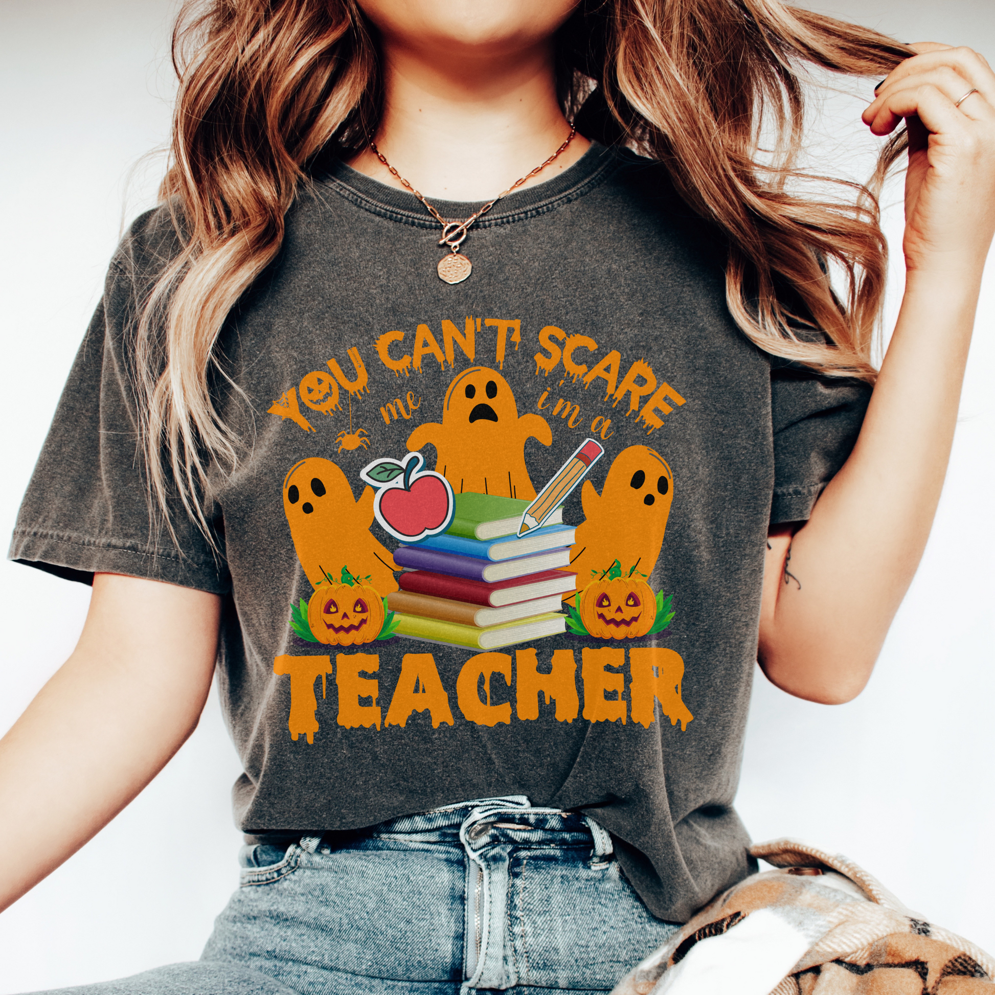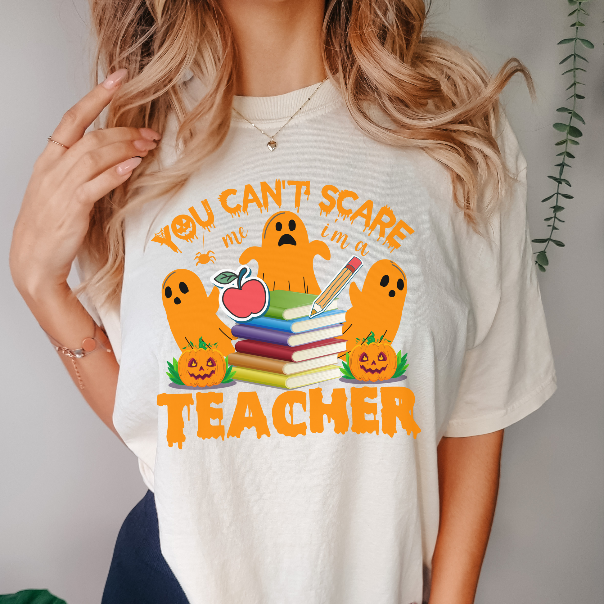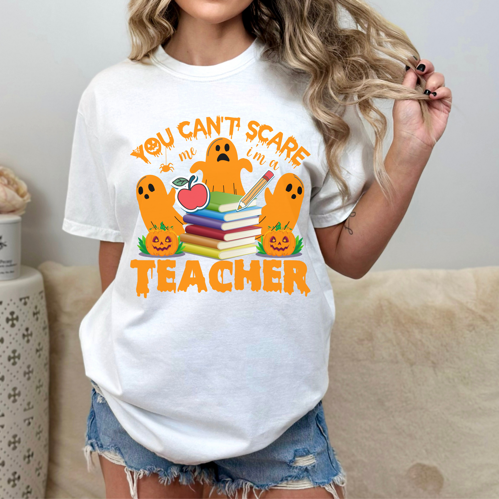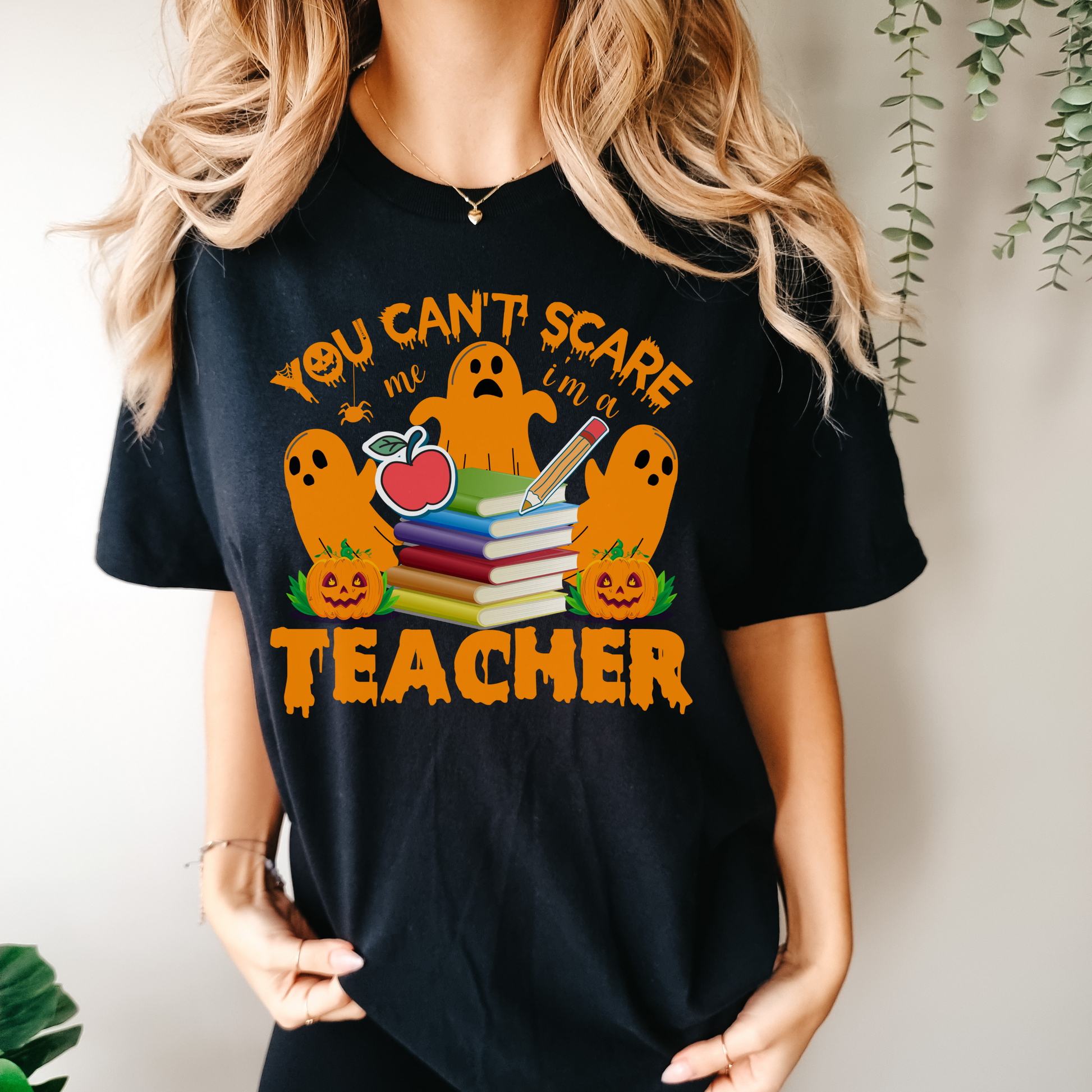 Get into the Halloween spirit while proudly displaying your dedication as a teacher with our "You can't scare me, I'm a teacher" t-shirt. The playful design includes a ghost, pumpkin, spider, apple, and school book, capturing the festive mood while highlighting the fearless nature of educators. Show your Halloween spirit and let everyone know that you fearlessly conquer any challenge in the classroom.