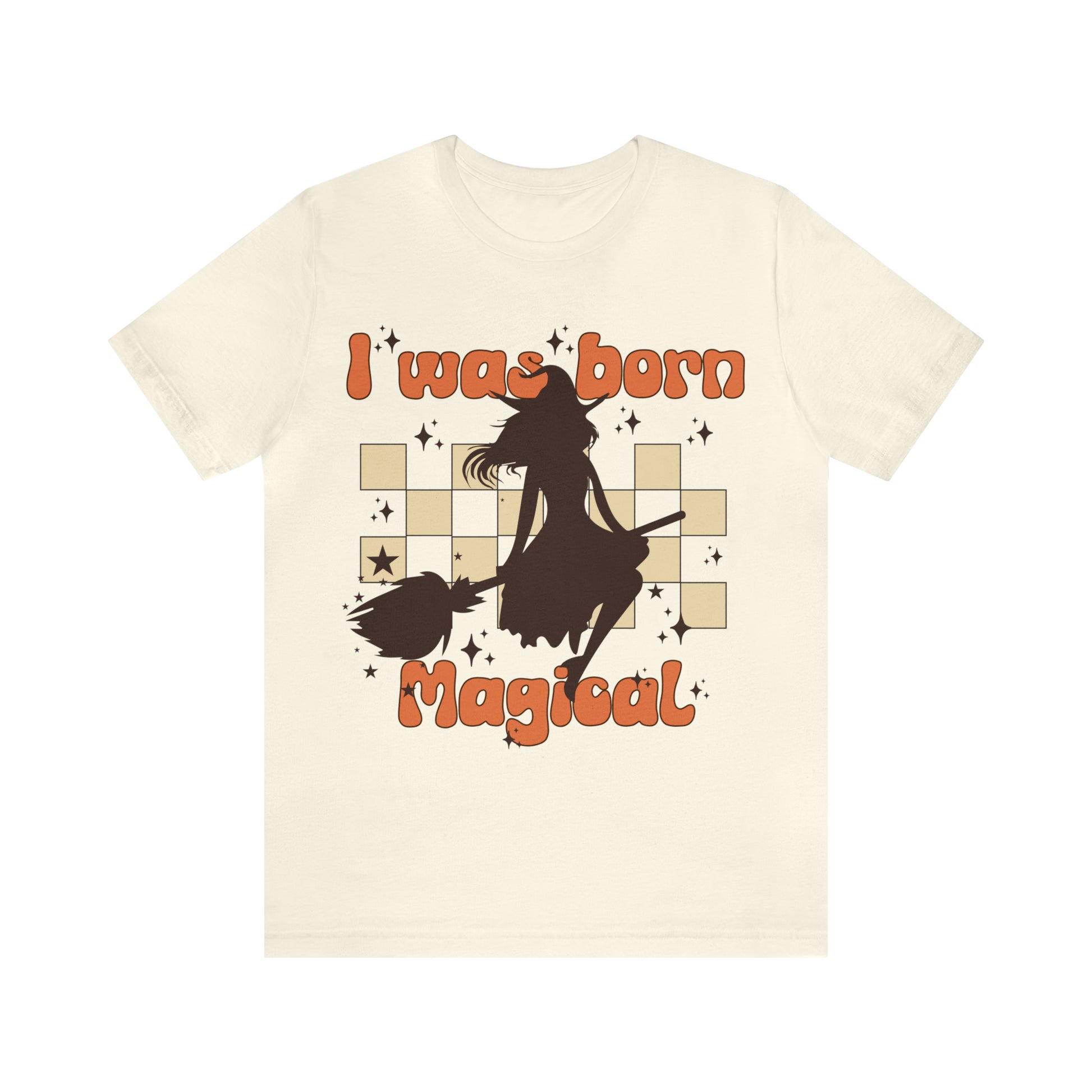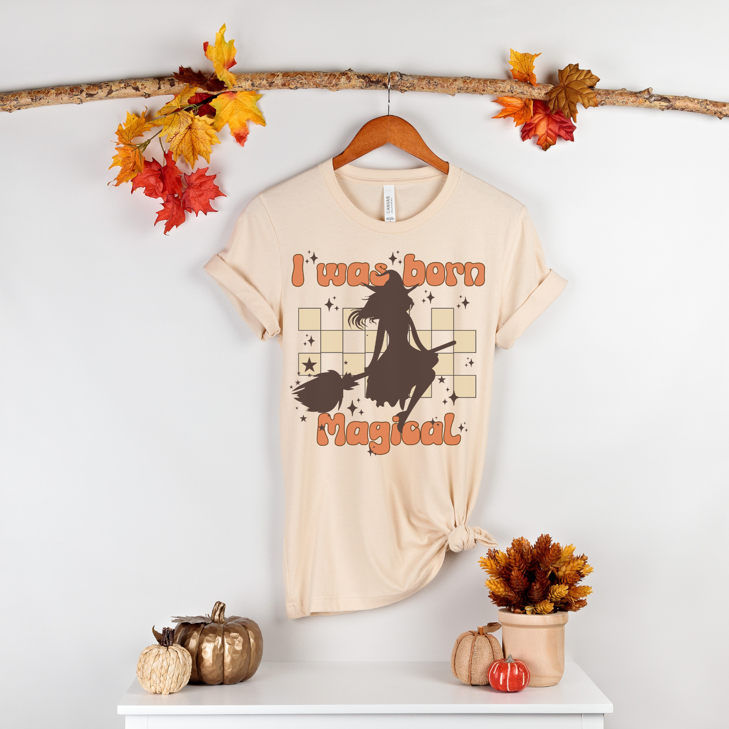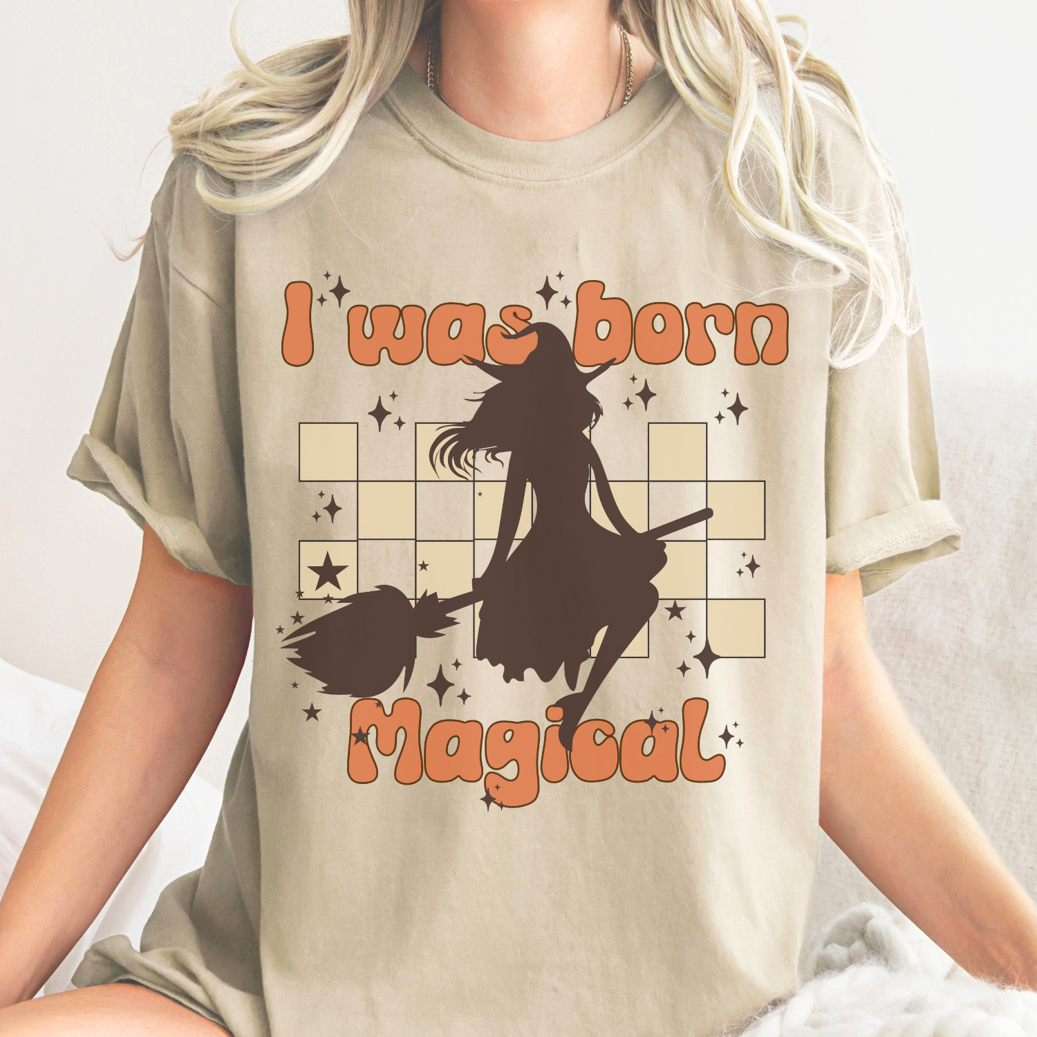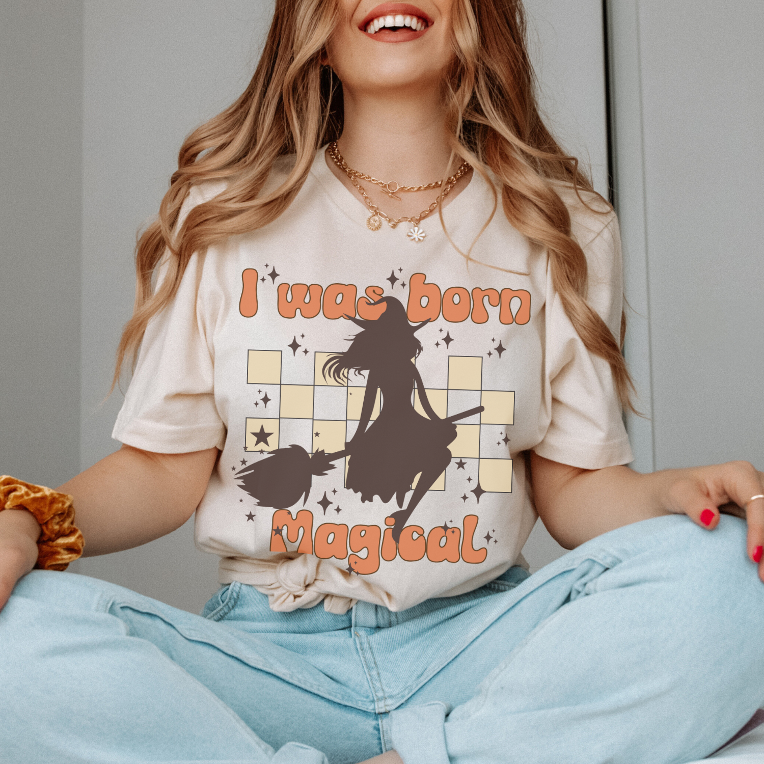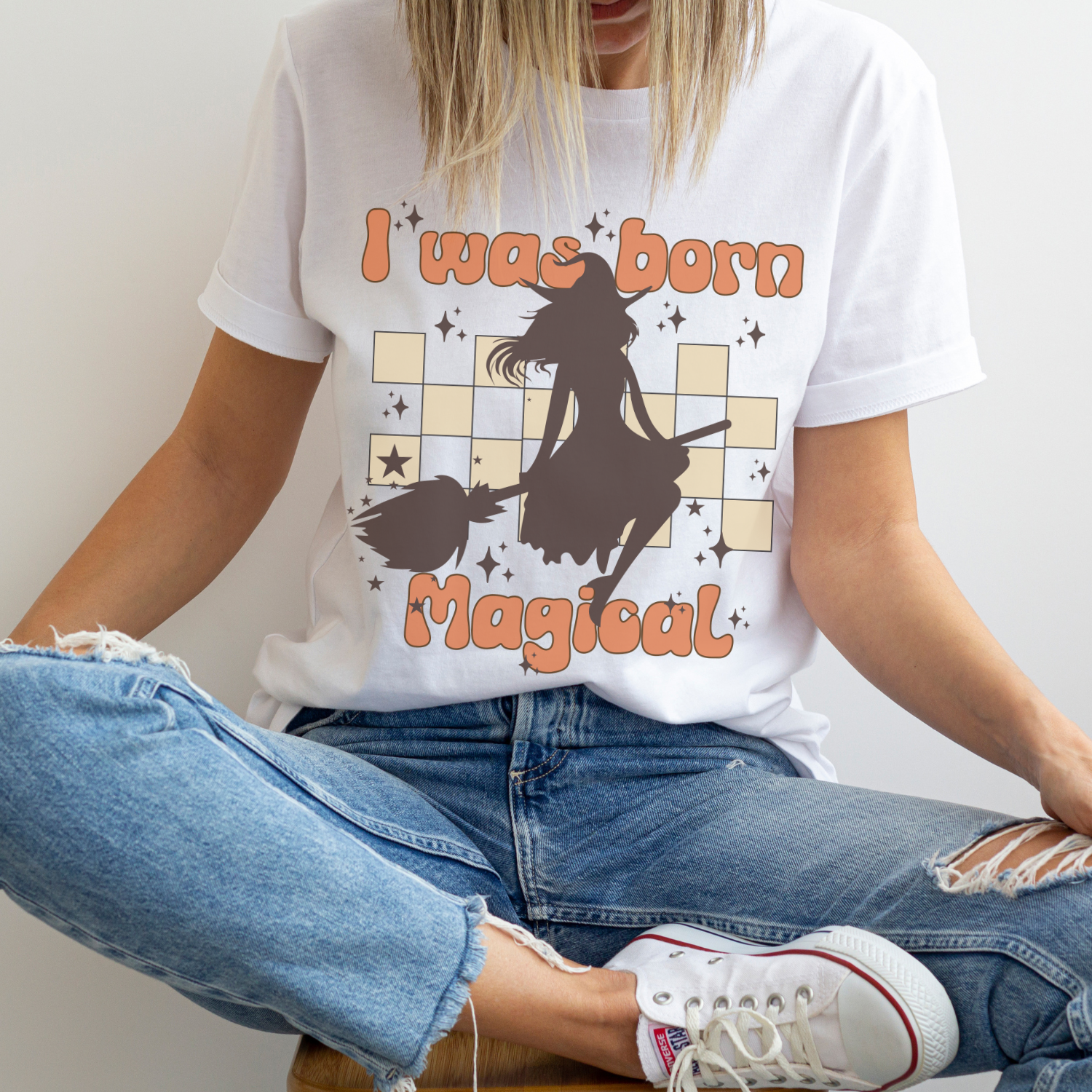 Unleash your inner enchantress with our retro witchy t-shirt, a magical blend of nostalgia and empowerment. With its soft fabric and bewitching imagery, a witch silhouette and bats, proudly declaring "I Was Born Magical,” it’s sure to bring a smile to your face every time you put it on. Step into your day with a dash of enchantment, as this shirt becomes your talisman of happiness and self-assuredness.