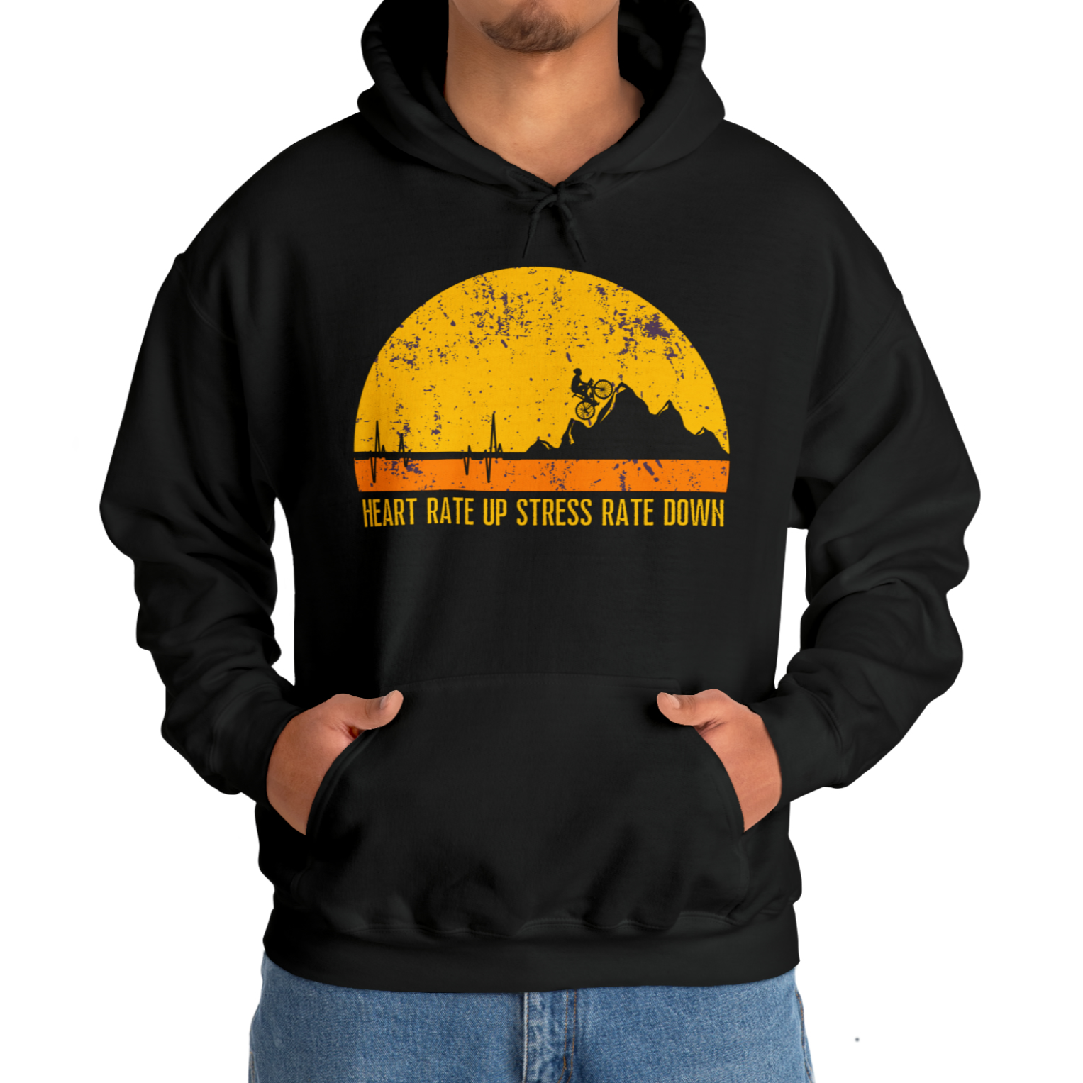 Get ready to rev up your heart rate and dial down stress with our mountain biking hoodie. Featuring a fearless rider on steep mountain slopes, it captures the thrill and peace of the trails. Designed for performance and comfort, it's a must for avid mountain bikers. As a gift, it adds style and promotes an active, stress-free lifestyle.