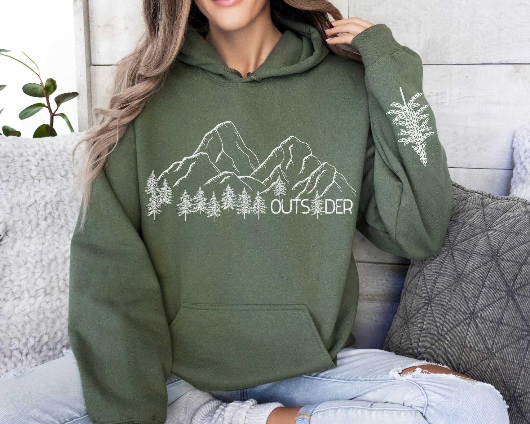 Embrace your outsider spirit with our unisex hooded sweatshirt, adorned with a captivating mountain forest scene and the bold text "outsider." It's an ode to those who find solace and adventure in the great outdoors. To add a touch of nature's beauty, we've also included a charming tree print on the sleeve. This sweatshirt not only represents your love for the wild but also adds a unique and artistic element to your wardrobe. Stand out and stay cozy with every wear!