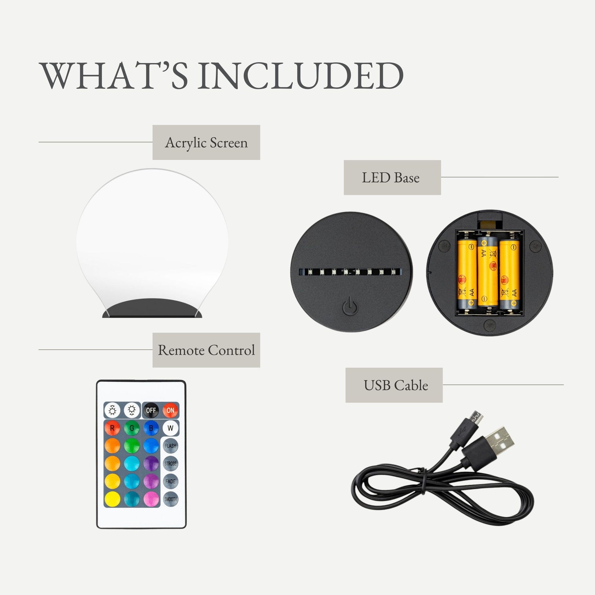 Acrylic dimensions shown in photos - LED light base: 3 1/2" x 3 1/2", offering 16 different color options