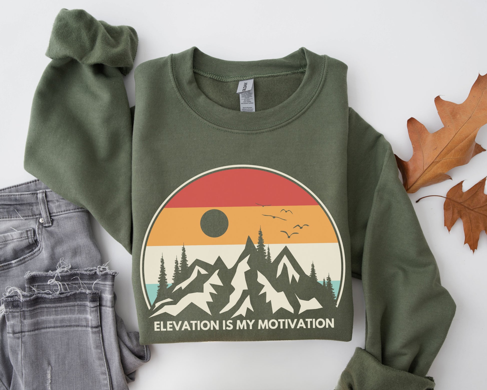 Elevate your journey with our unisex sweatshirt, showcasing a stunning mountain scene against a retro sunset backdrop. The statement "Elevation is my Motivation" inspires you to embrace the unknown and ascend to new heights.