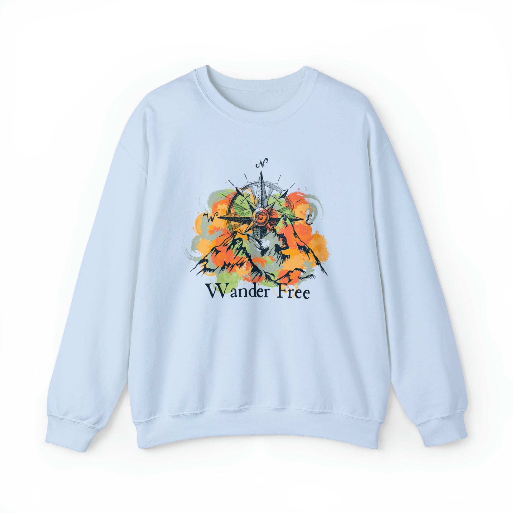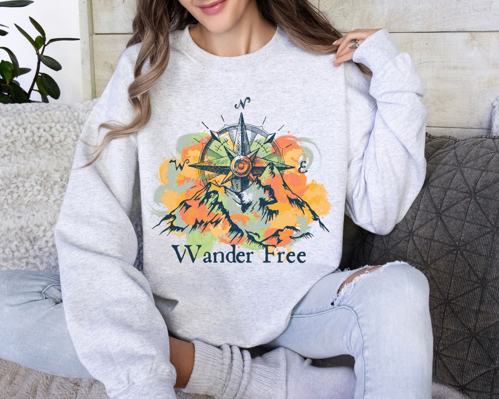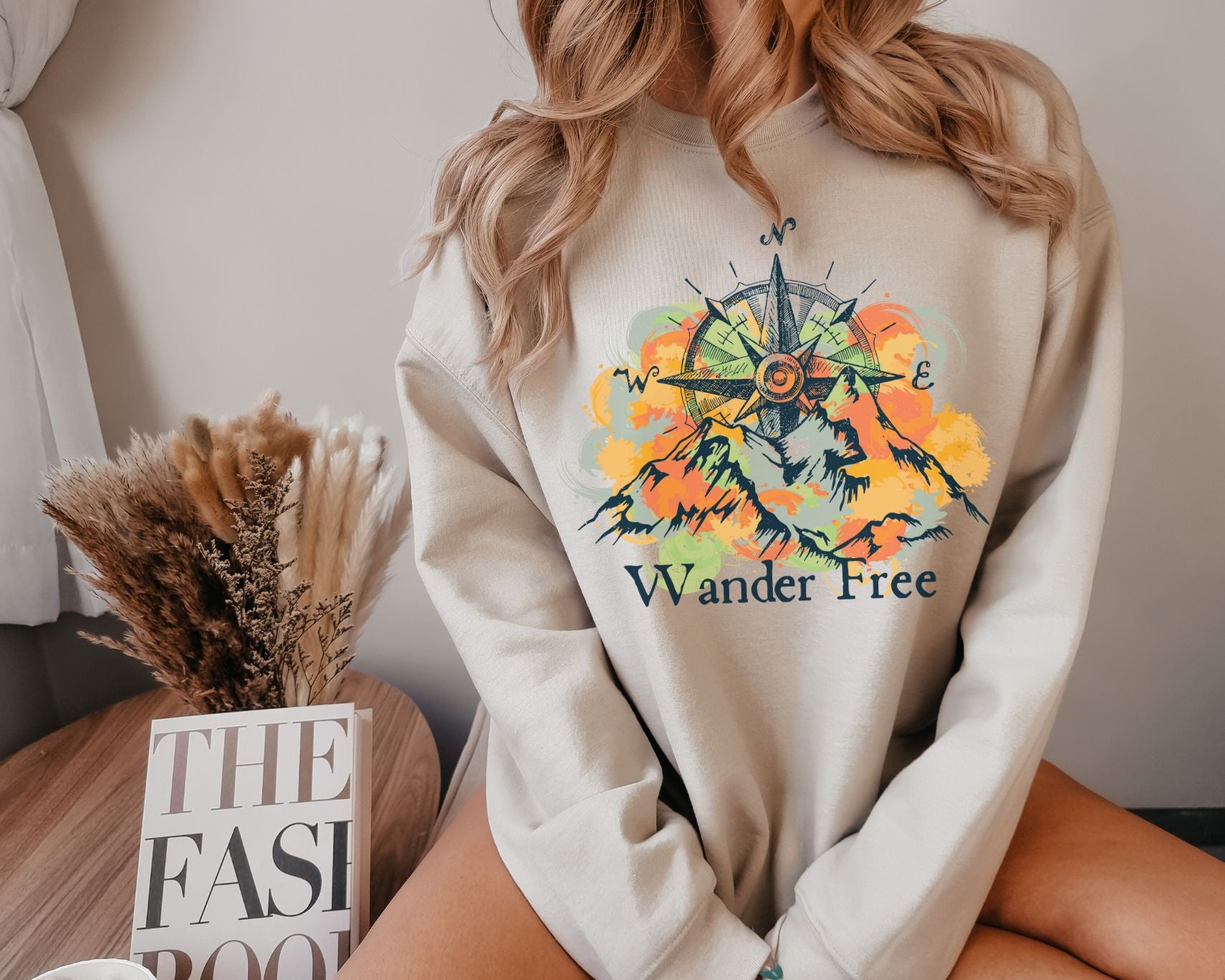 Get ready to wander with our unisex sweatshirt, featuring a vibrant compass and mountains. The message "wander free" is an invitation to explore the world, making this sweatshirt an ideal choice for adventurers with a sense of direction.