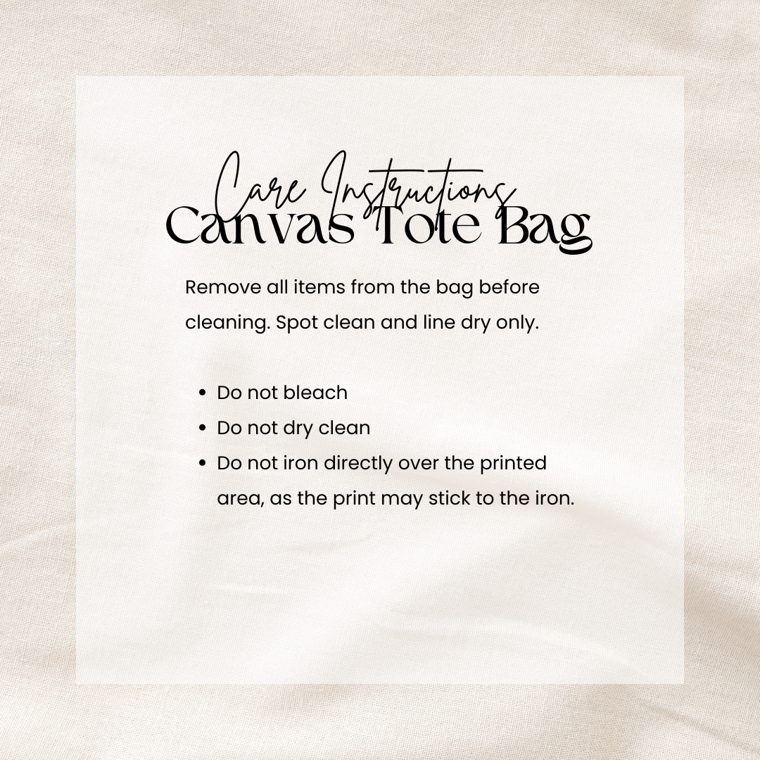 Remove all items from the bag before cleaning. To protect the life of your tote bag, we recommend Machine washing in cold water (max 30C or 90F); Non-chlorine bleach as needed; Tumble dry: medium heat; Do not iron directly over the printed area - print may stick to the iron.