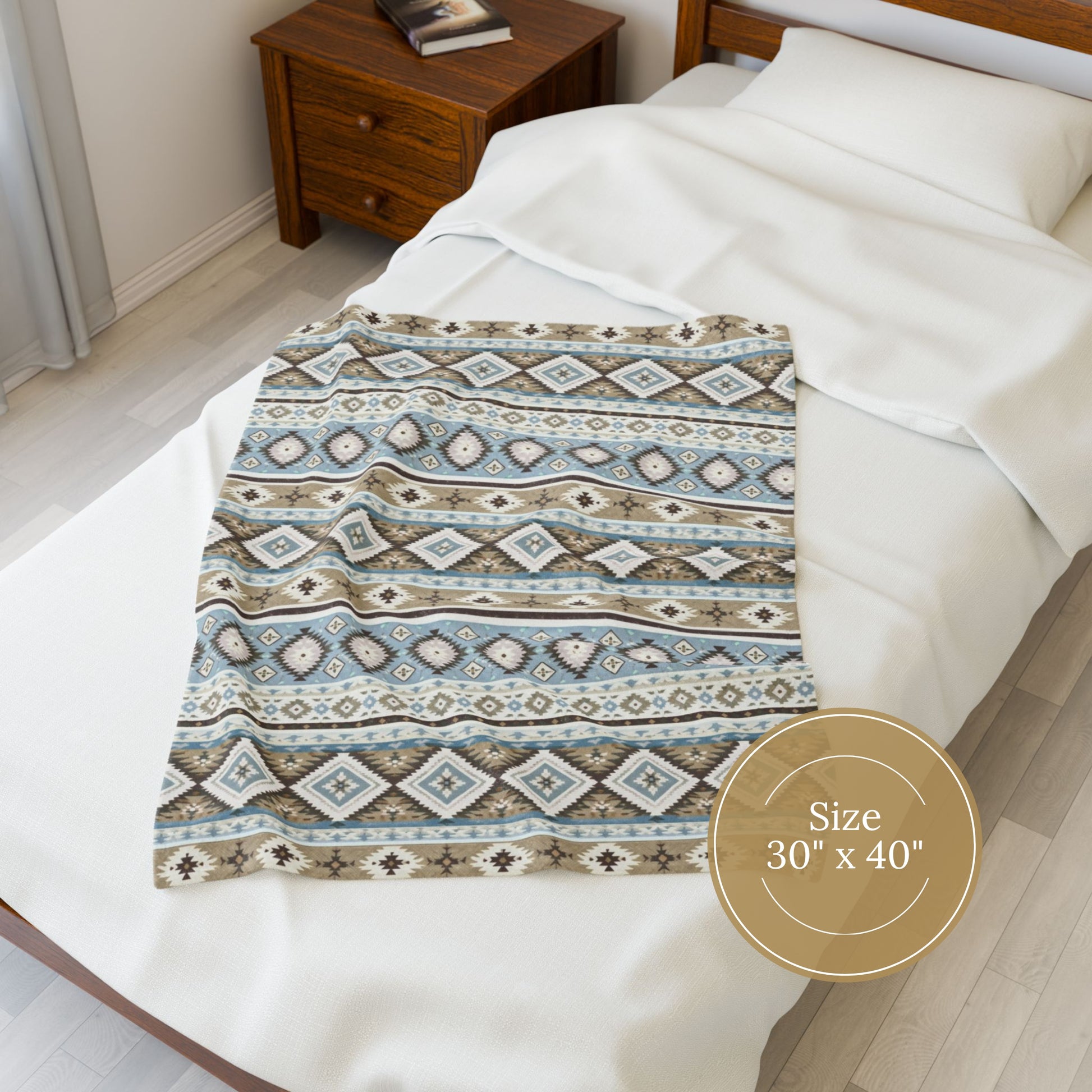 This blanket features a soothing mix of soft blues, warm neutrals, and timeless geometric stripes and diamonds, inspired by the region’s earthy, handcrafted color palettes.