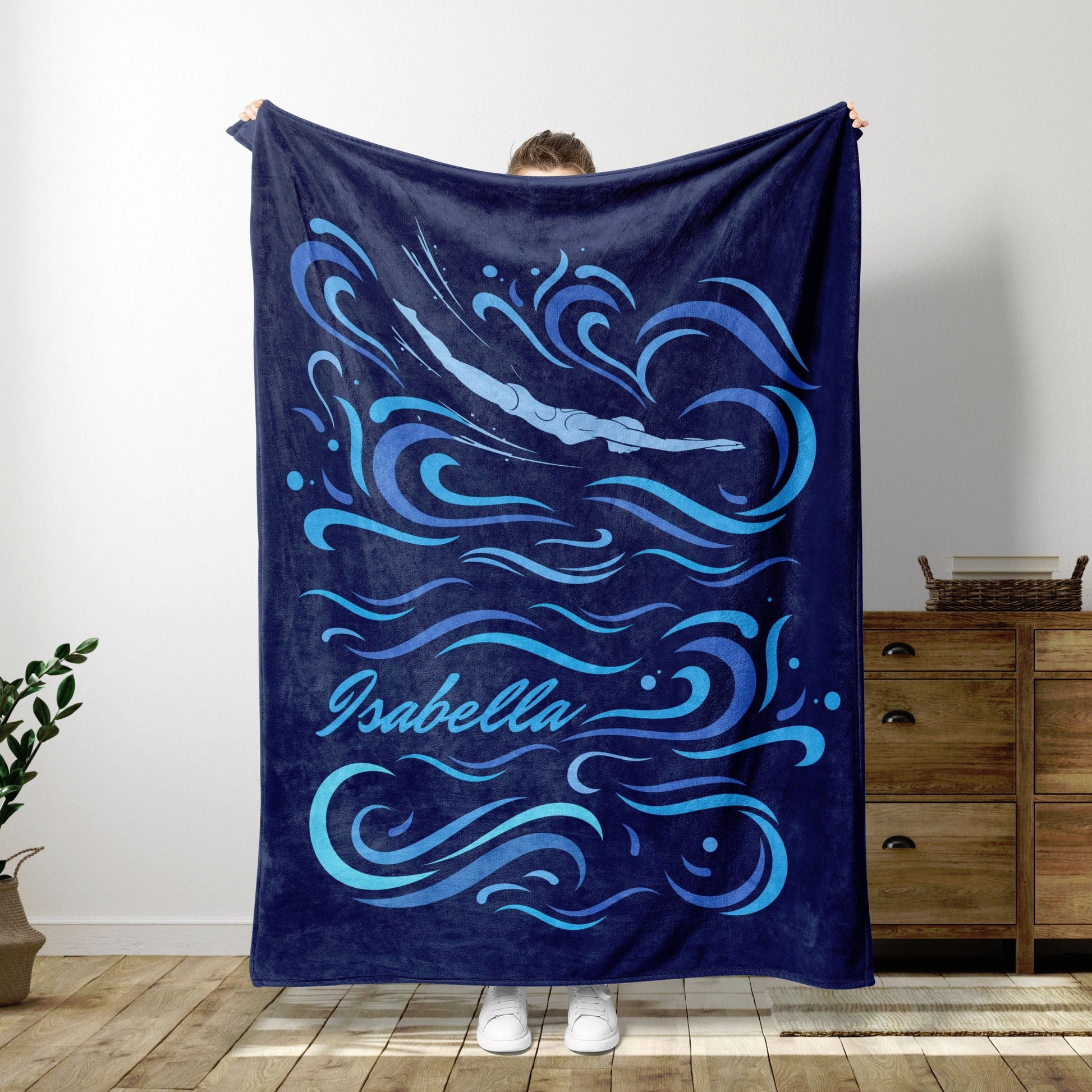 Dive into comfort and style with our personalized swim blanket, featuring a captivating design of a swimmer gracefully diving into wavy waters. Available in three vibrant colors: Navy Blue, Royal Blue, or Black, this cozy blanket adds a touch of aquatic elegance to any space. Personalize it with their name for that extra special touch. Whether lounging poolside or snuggled up at home, this swim blanket is the perfect accessory for any water enthusiast. It makes for a thoughtful and practical gift for swimmers, providing warmth and comfort after a refreshing swim session. Treat yourself or surprise a loved one with this unique and thoughtful gift.
