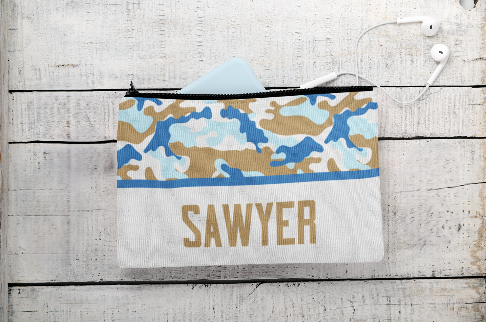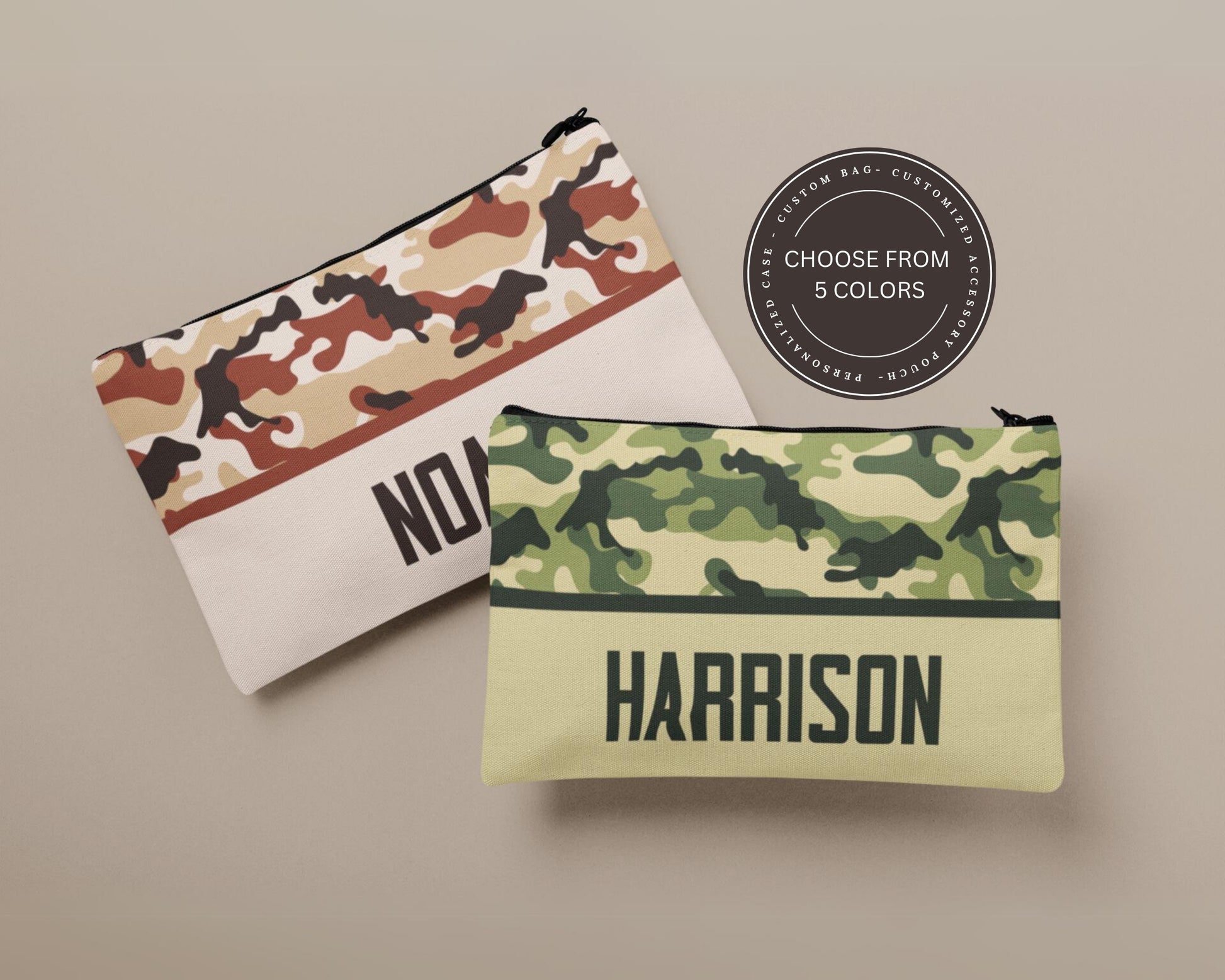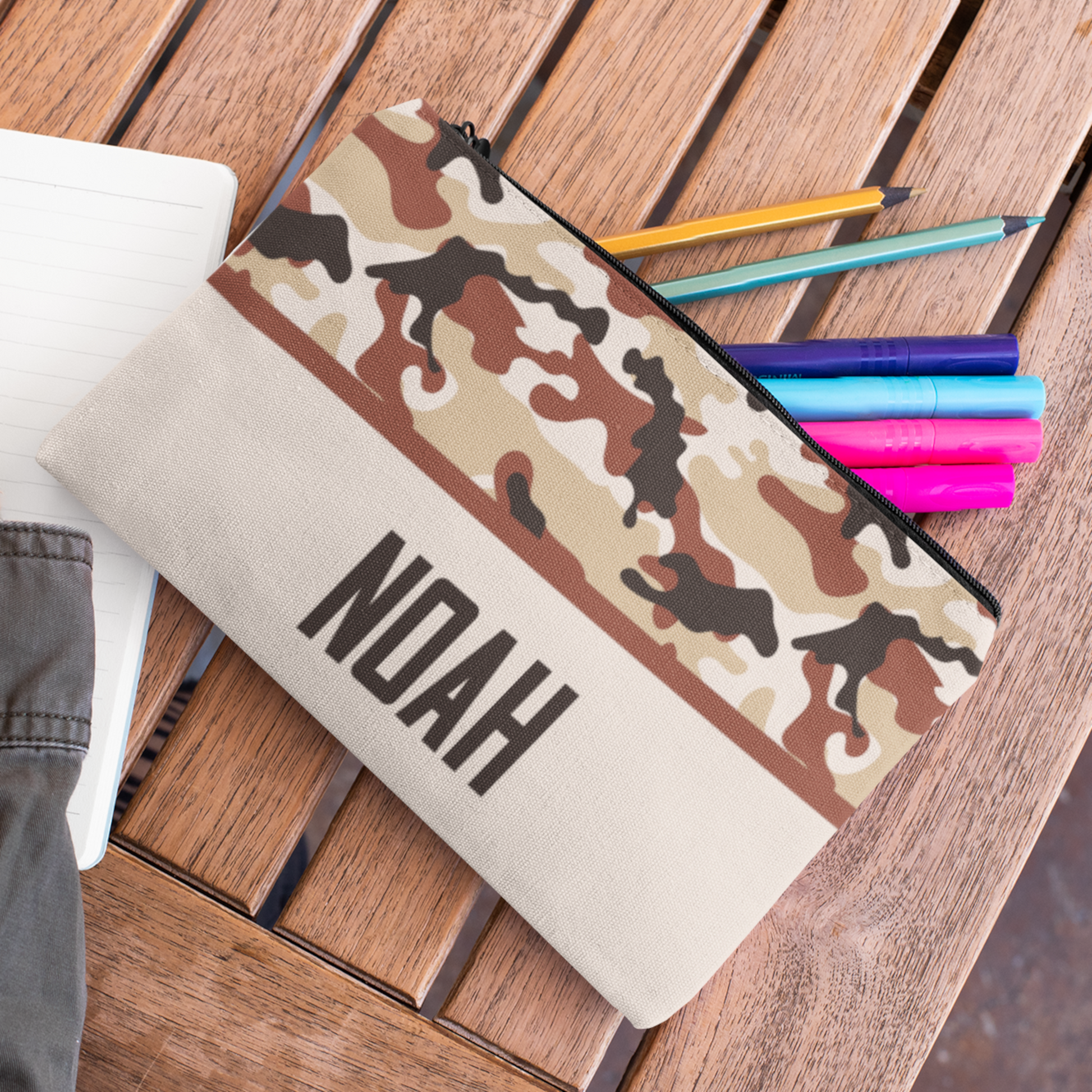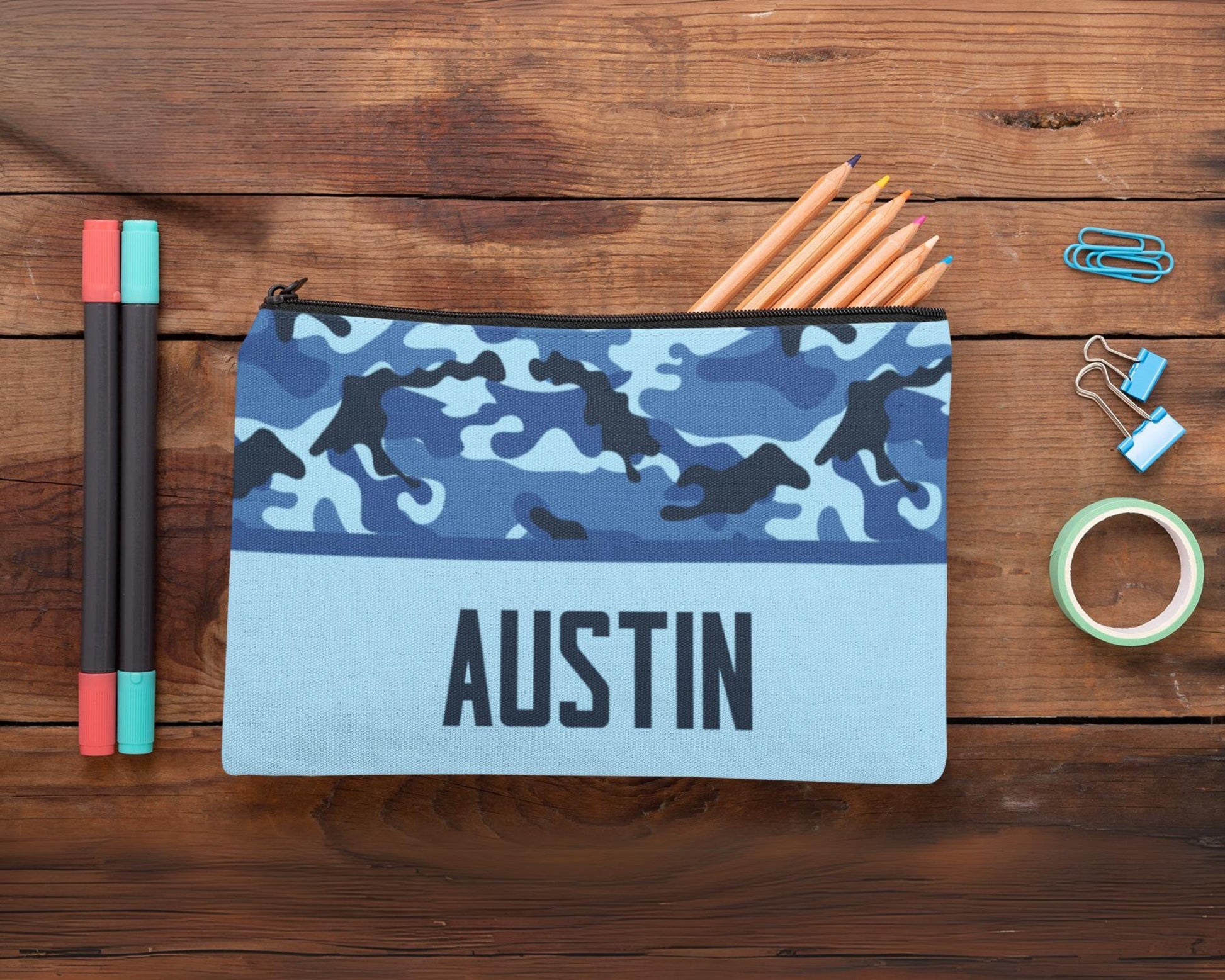 Stay stealthy and stylish at school with a camo pattern pencil case, available in five colors and personalized with your name. The perfect back-to-school gift for the student in your life!