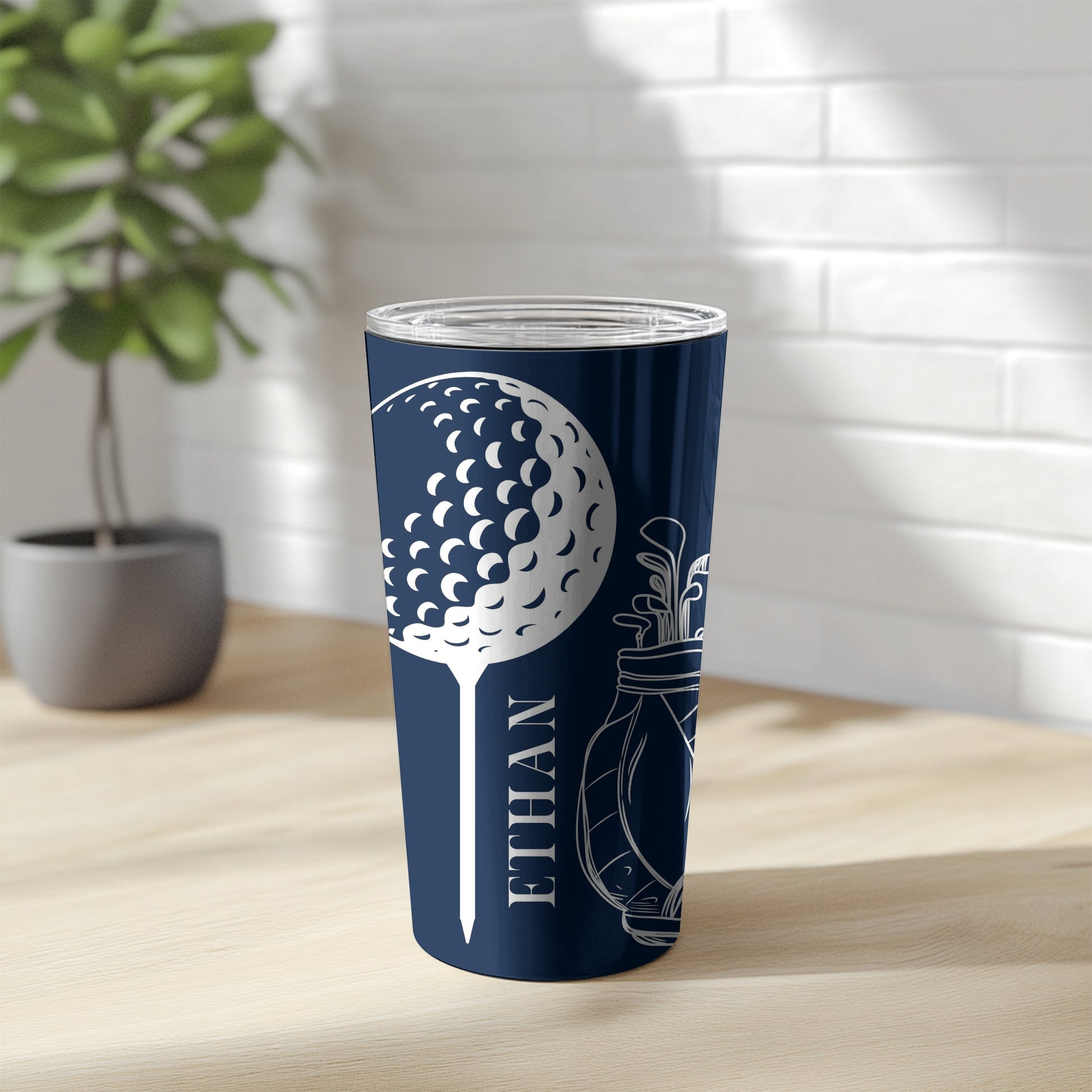 Celebrate your favorite golfer with our custom name 20 oz Stainless Steel Tumbler! With a clean, classic design featuring a golf bag, tee, and ball, this travel mug honors a love for the game, made even more special with personalization. Whether you're cheering on Dad, showing support for Mom, or recognizing a beloved coach or team member, this thoughtful gift is a practical and stylish essential. Perfect for the course or relaxing afterward, the double-wall insulation keeps drinks hot or cold for hours. It’s crafted from durable stainless steel with a sleek, glossy finish, a wide mouth for easy cleaning and filling, and a spill-resistant lid, built for busy days and on-the-go moments.