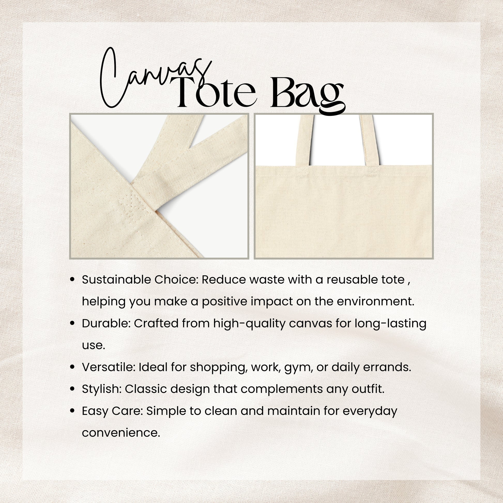This durable 100% cotton canvas tote bag is a must-have for everyday use. With a spacious 15" x 16" size and strong 20" handles, it’s perfect for carrying everything from groceries to books or adding a touch of style to your daily look. The sturdy canvas construction ensures it will stand up to regular use while looking great.