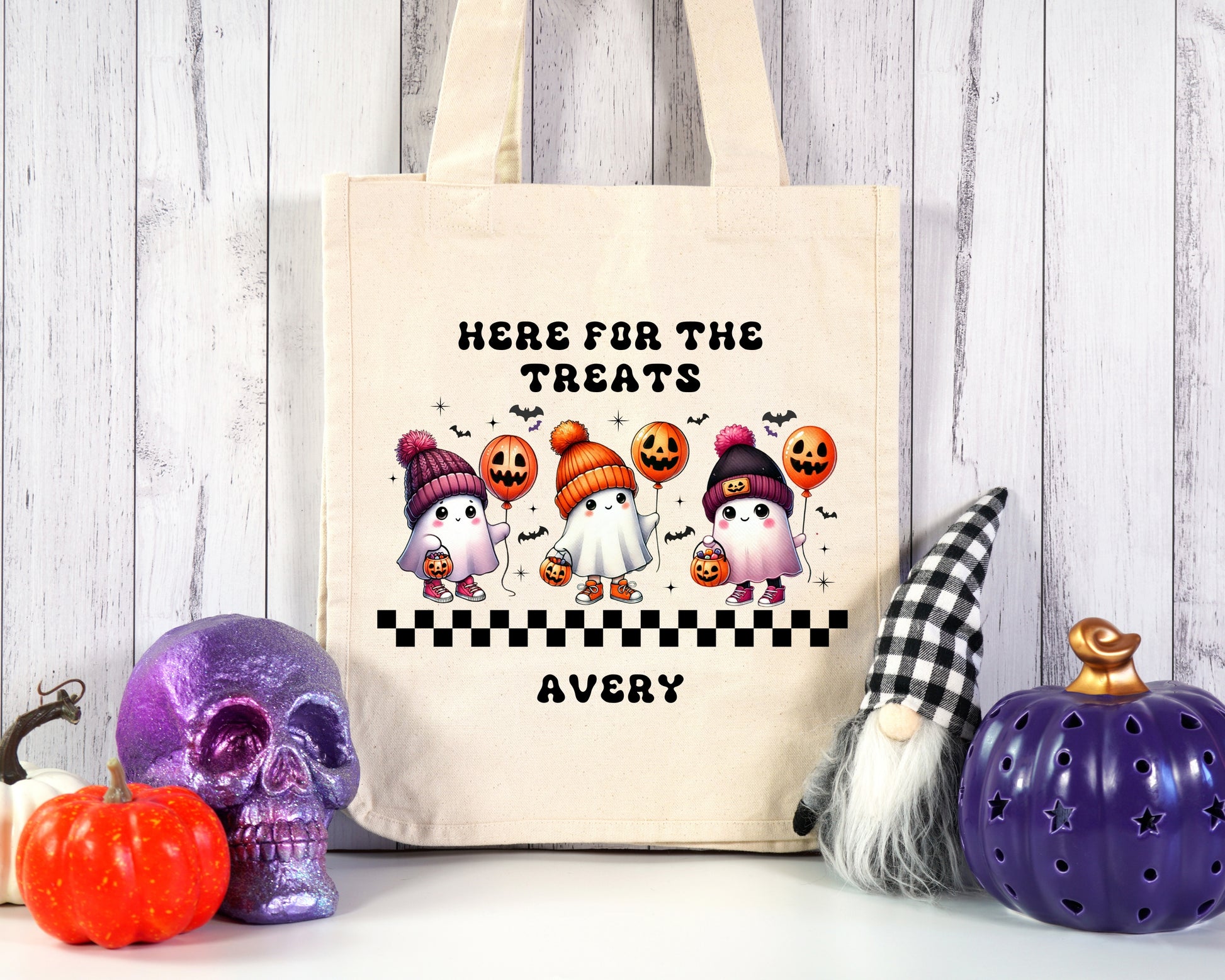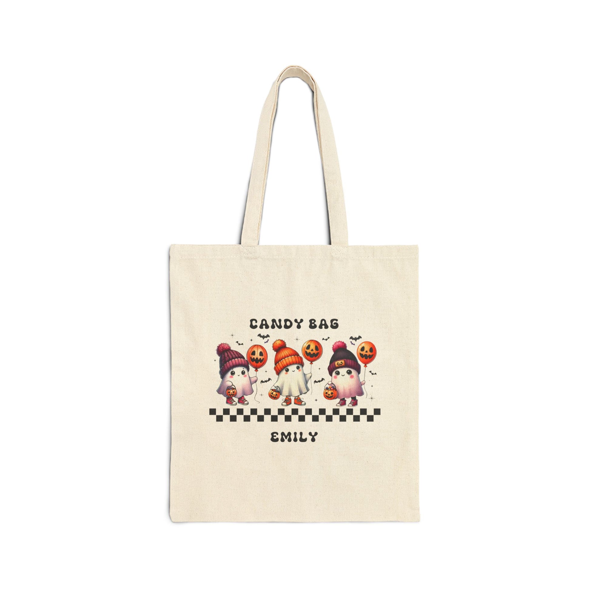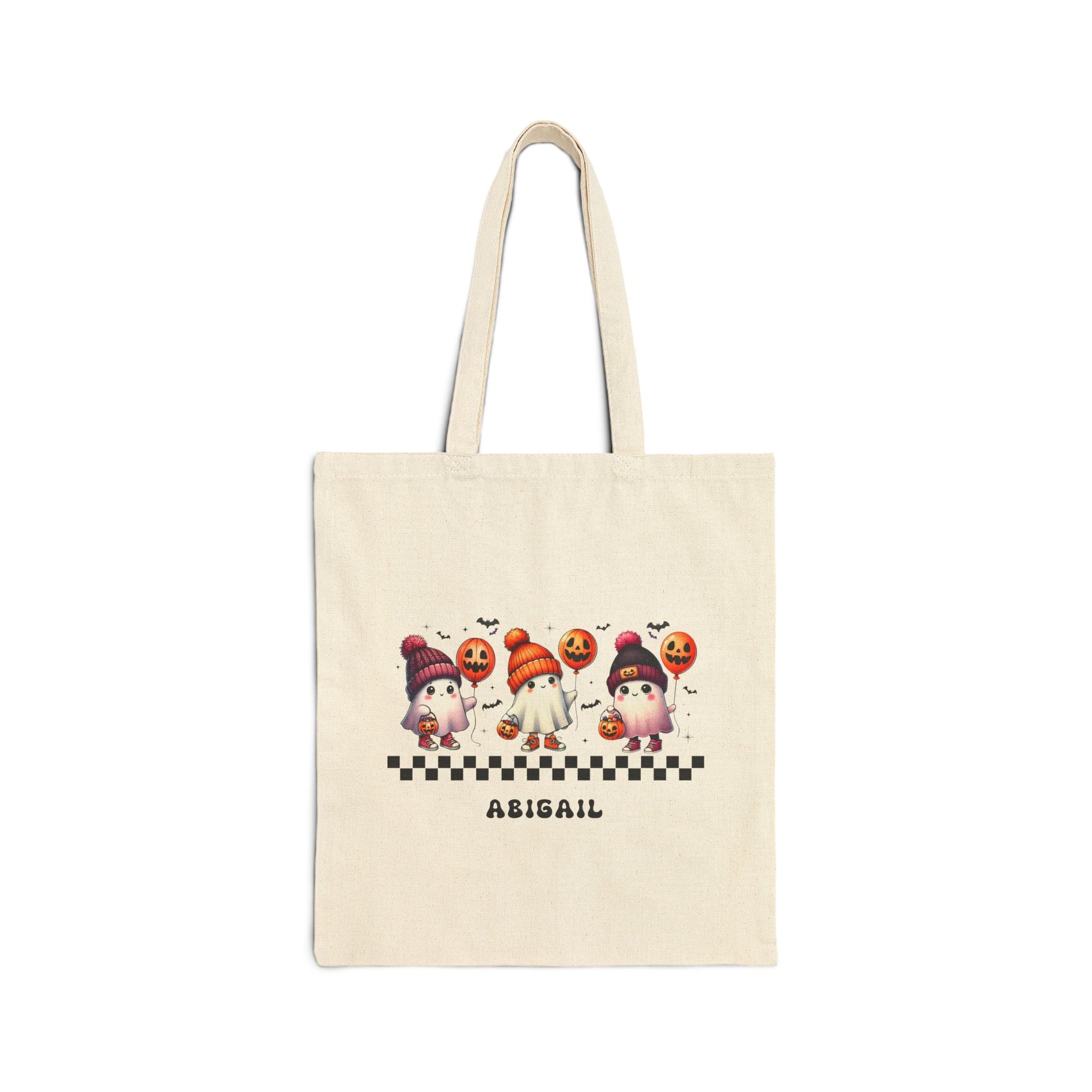 Get ready for a spooktacular Halloween with our Adorably Spooky Ghost Trick-or-Treat Bag! This charming bag showcases three cute ghosts all dressed up for trick-or-treating, adding a playful touch to the Halloween fun. Personalize it with your child's name and a saying of your choice to make it uniquely theirs. Crafted from durable materials, this bag is perfect for gathering a hauntingly good haul of Halloween treats. Make your little one's Halloween extra special with this one-of-a-kind treat bag!