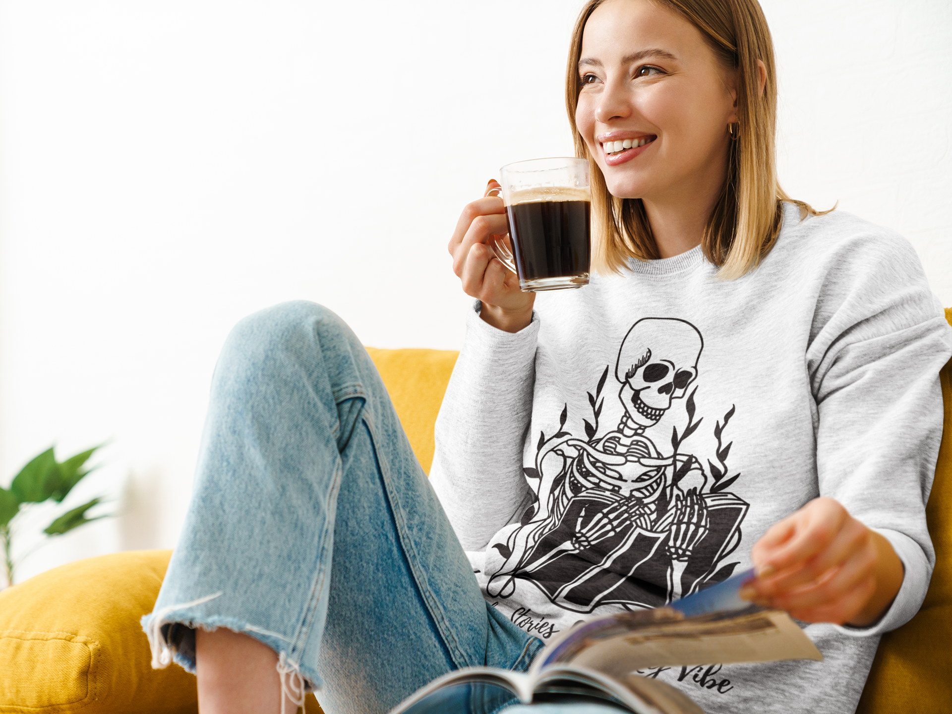 Embrace the enchantment of sinister tales and the warmth of cozy literature with our Skeleton Reading Sweatshirt. Crafted for the ultimate comfort, this sweatshirt envelops you in softness as you embark on thrilling literary journeys. The captivating image of a skeleton engrossed in its eerie book perfectly mirrors your love for spooky novels. The "Spooky Stories are My Vibe" text serves as a declaration of your passion and connects you with a community of fellow book-loving women who relish in the supernatural. Whether it's a stormy night or a crisp autumn evening, let this sweatshirt be your loyal companion, enhancing the joy of reading time with its snug embrace and bewitching design.