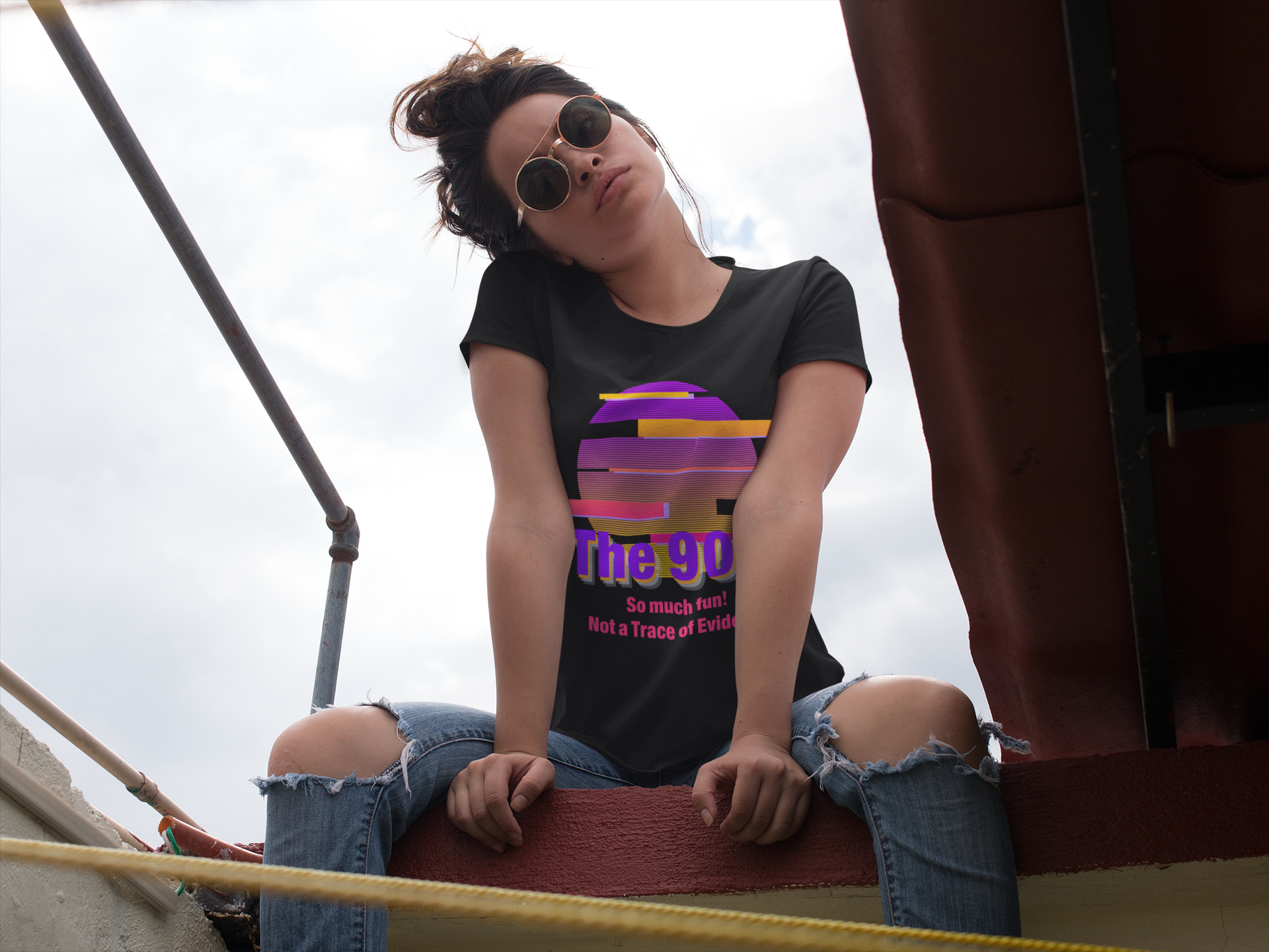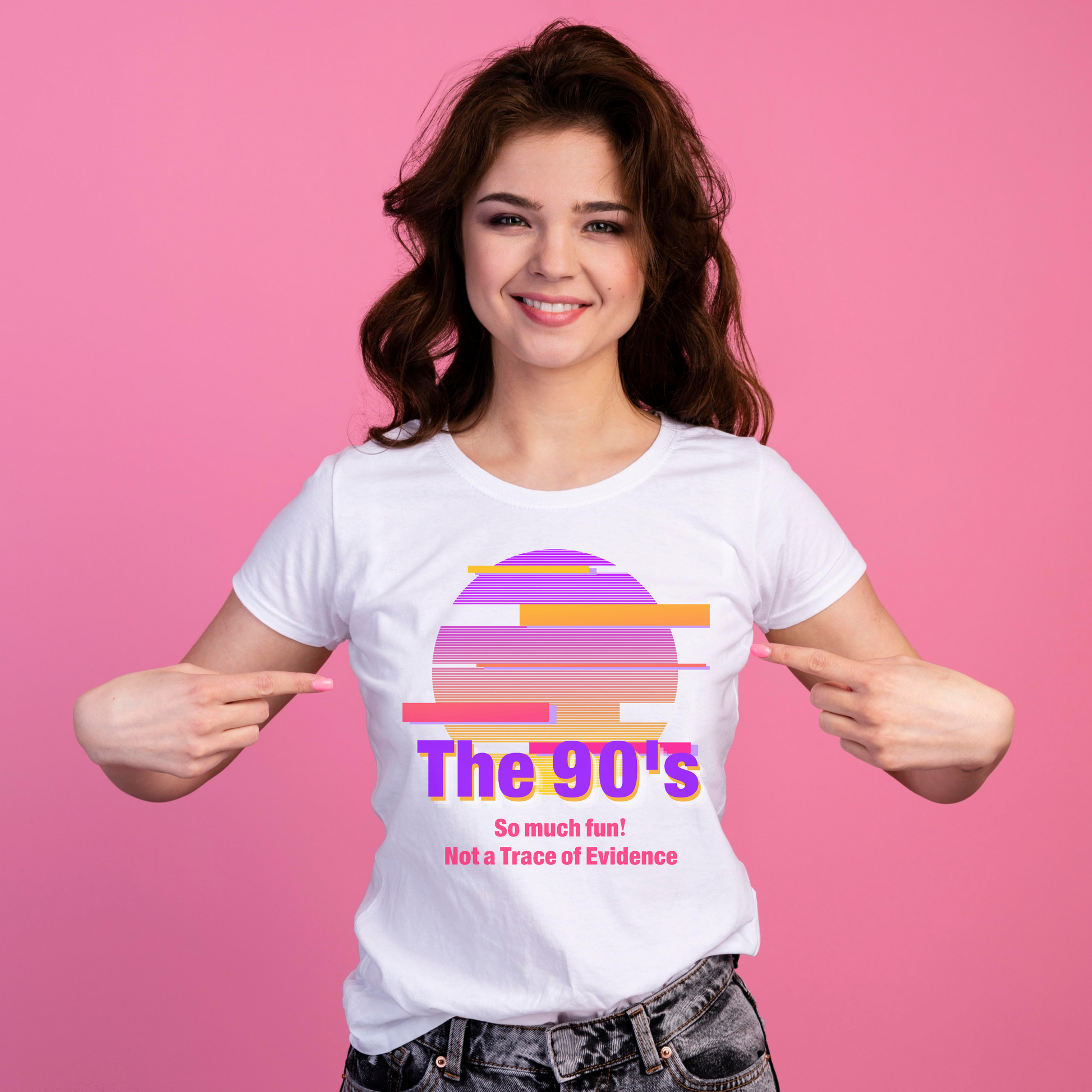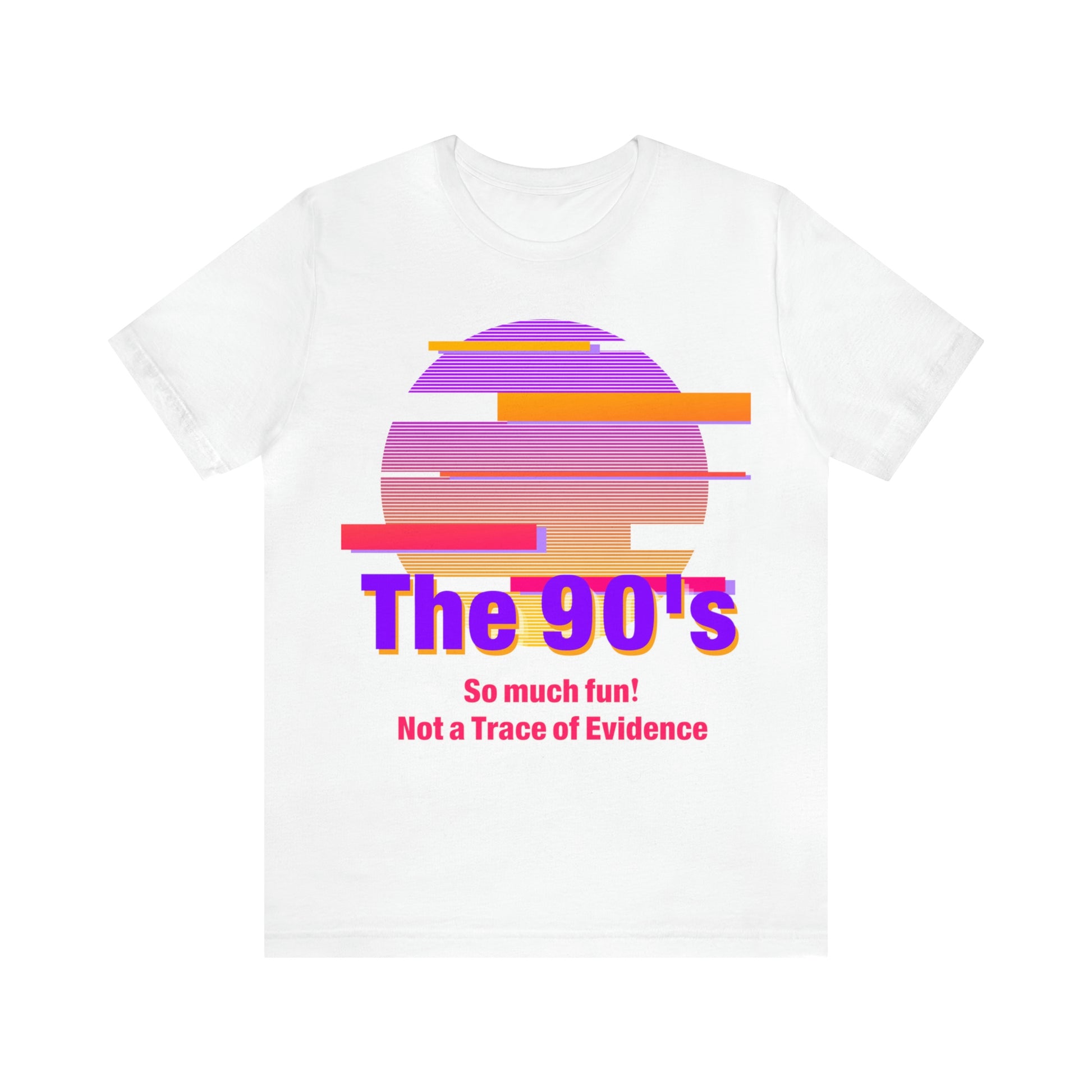 This shirt features the phrase, "The 90's. So much fun, not a trace of evidence," perfect for anyone who remembers the carefree days of their youth.