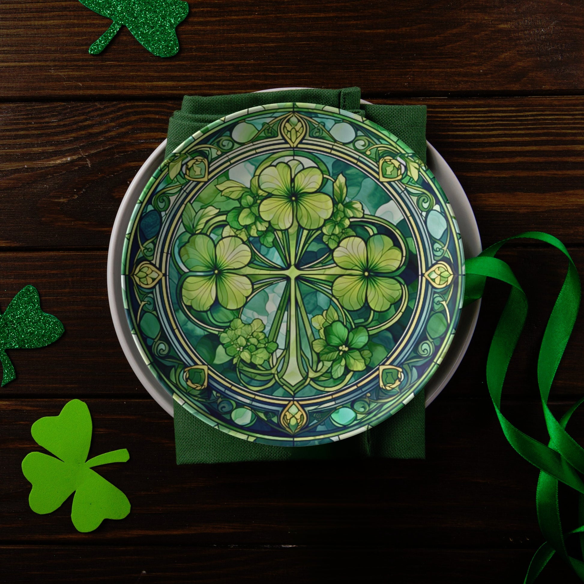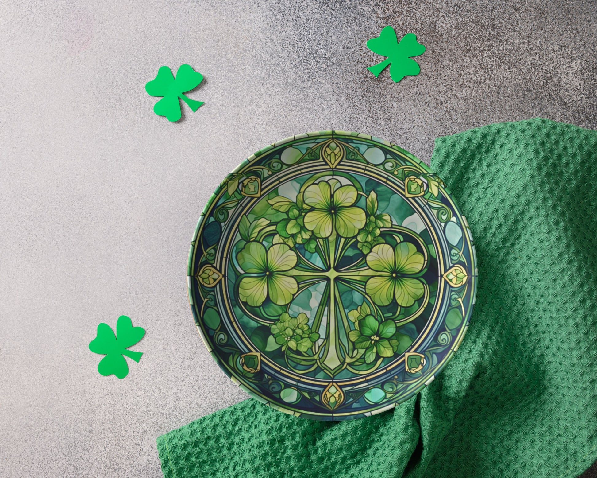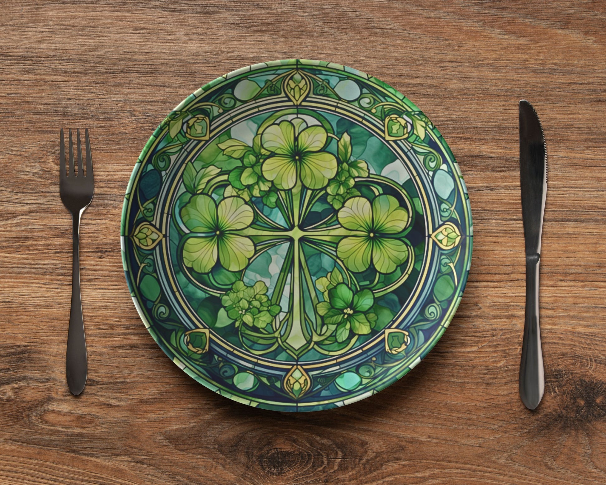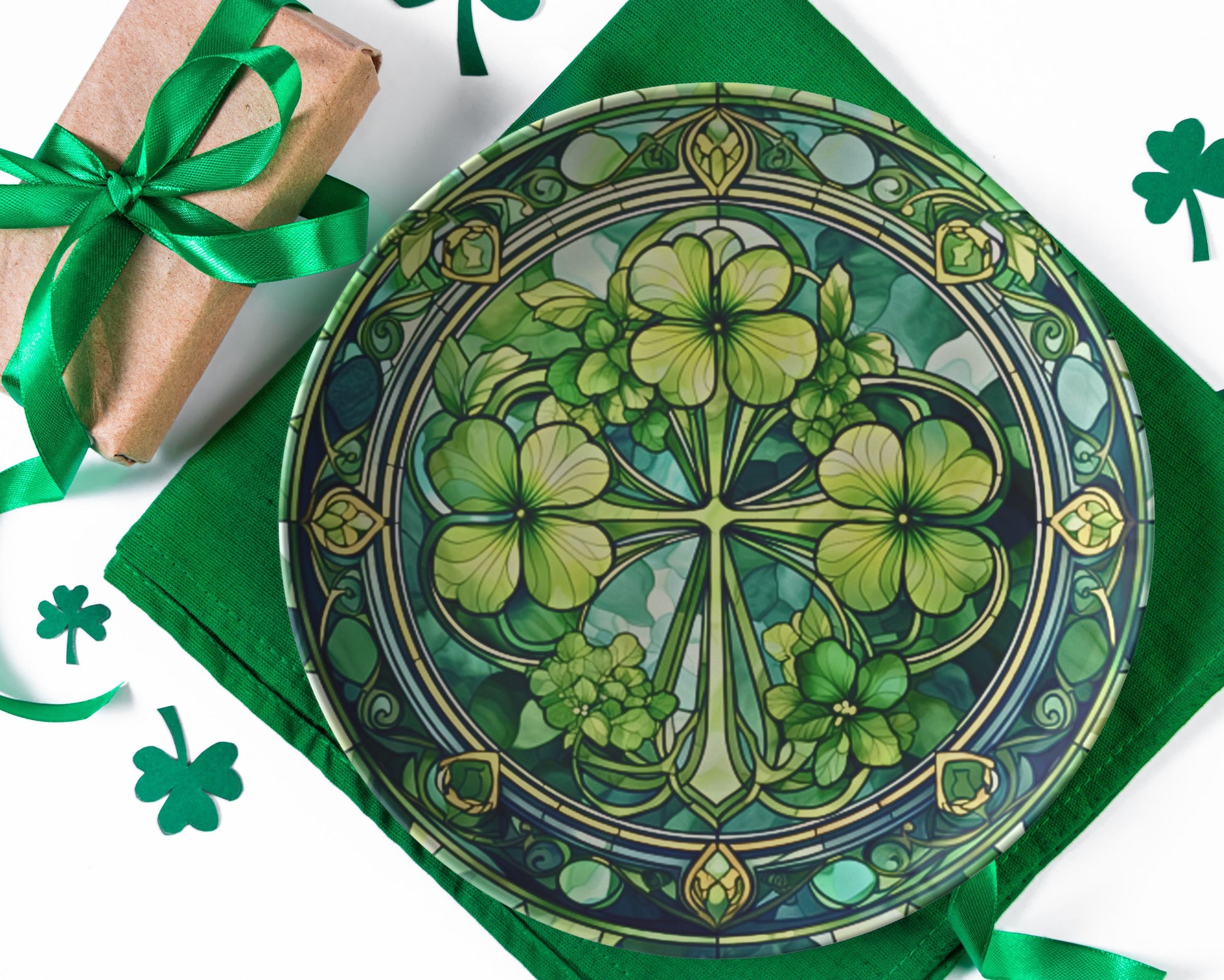 Celebrate St. Patrick's Day in style with this Thermosaf polymer plastic plate adorned with charming 4-leaf clovers and a decorative border.