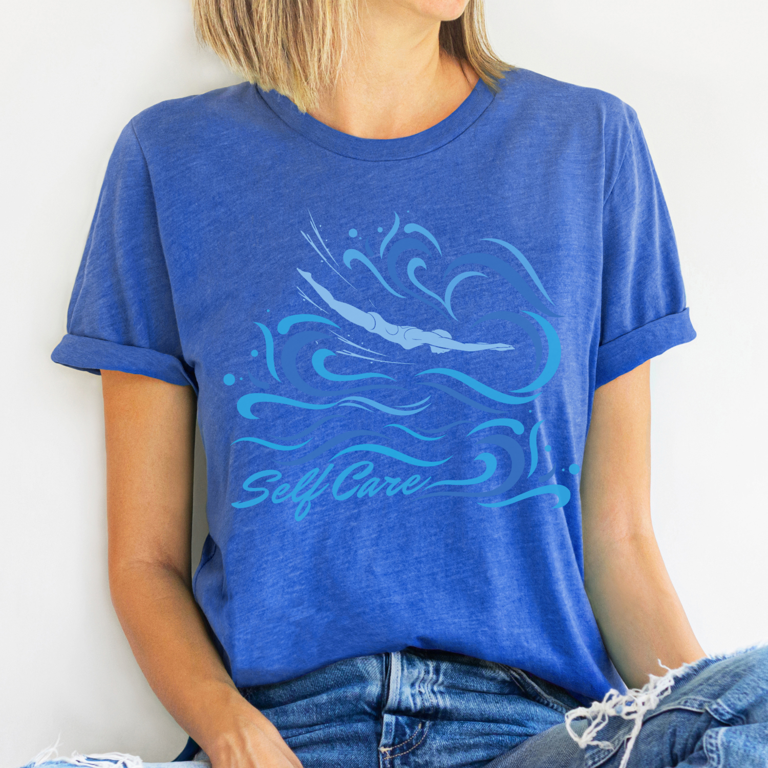 Dive into serenity with our "Self Care" Swim T-Shirt. This retro-inspired tee combines comfort and style, ensuring you feel at ease both in and out of the water. With a powerful message of self-care, it's a reminder to cherish moments of relaxation and rejuvenation. Embrace the joy of swimming while making a statement with this unique design – a perfect addition to your beach or pool adventures.