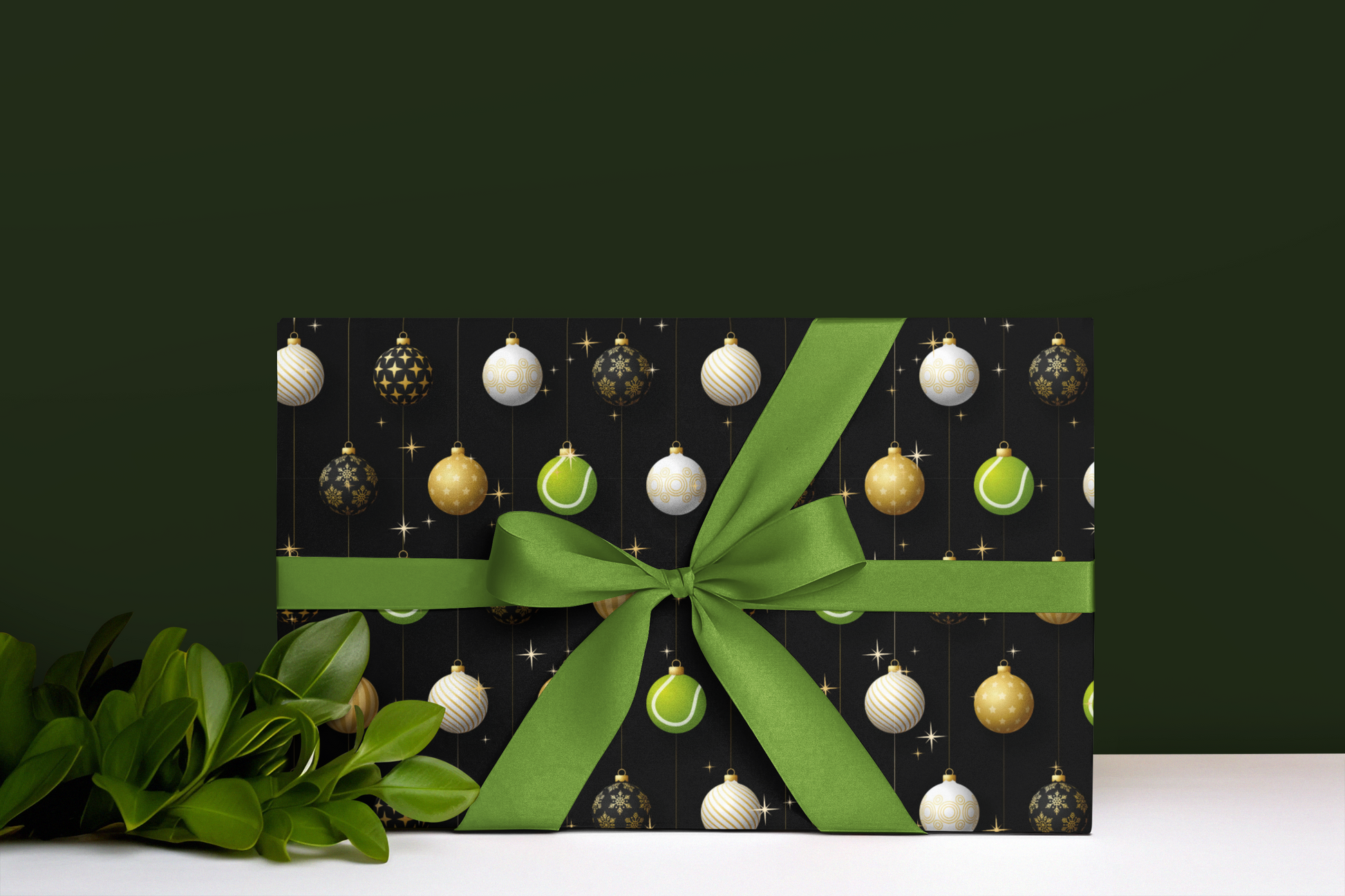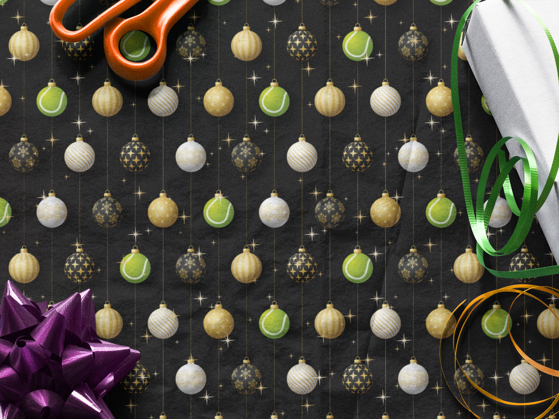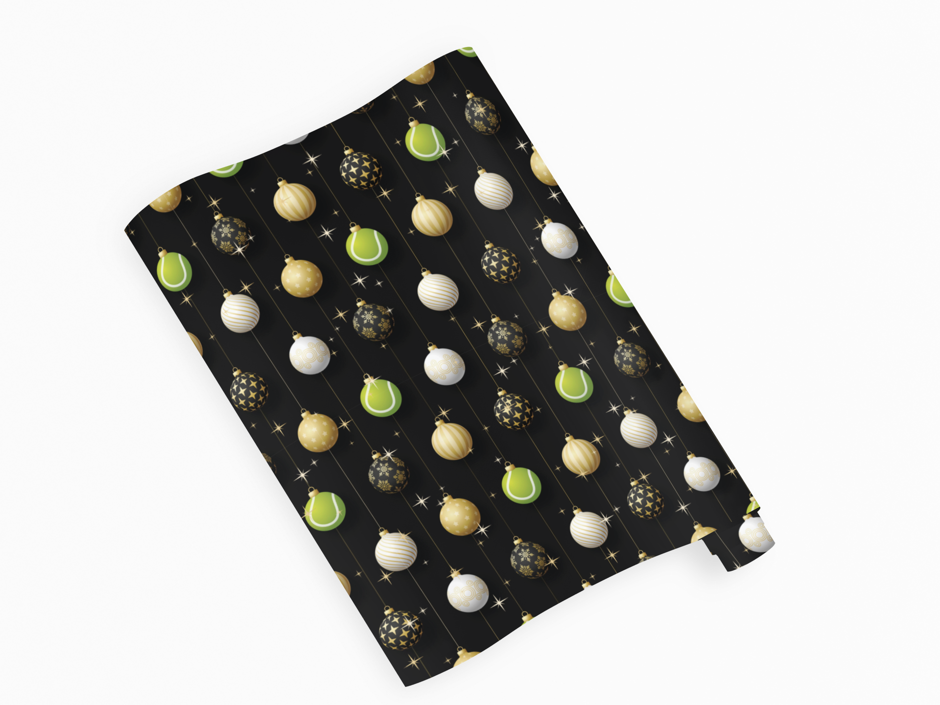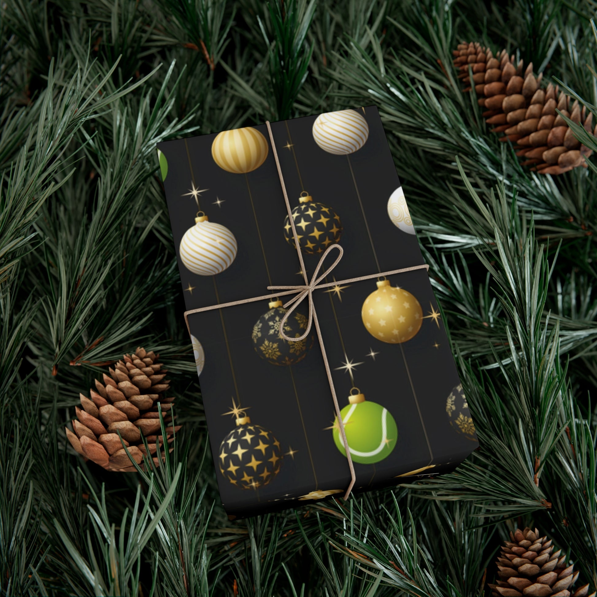 Serve Up a Merry Christmas with Tennis-themed Wrapping Paper! Adorned with Christmas ball ornaments and tennis ball designs, accompanied by golden stars and snowflakes, it's a match made in holiday heaven.